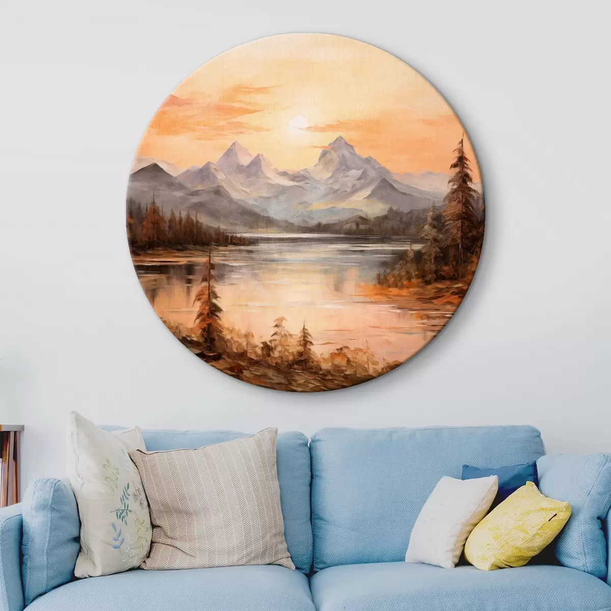 Runde Wandbilder Landschaft mit einem See, umgeben von Bäumen und Bergen im Hintergrund, orangefarbener Himmel mit Sonne r44857