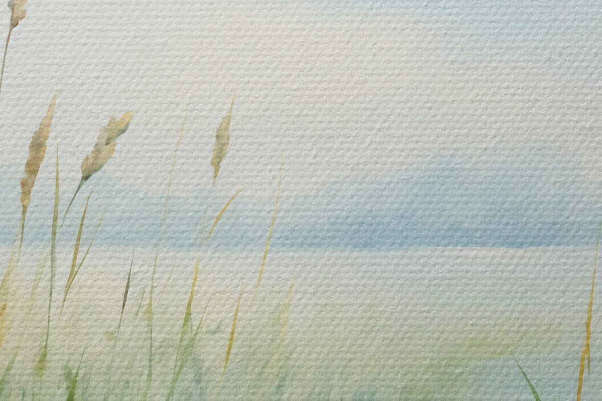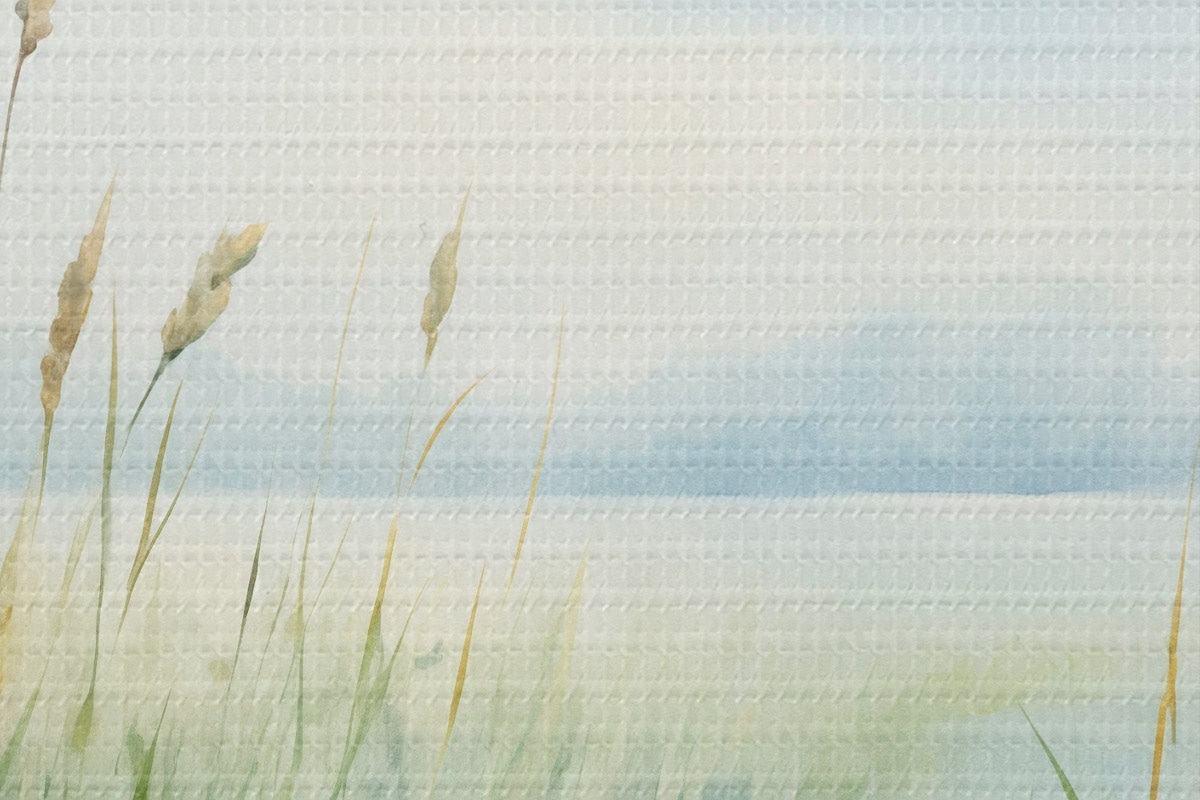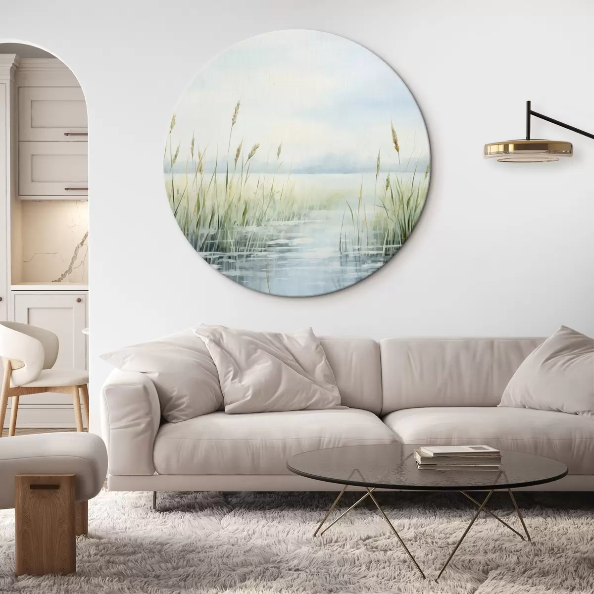 Runde Wandbilder Ein Aquarell Malerei Nachahmung der hohen Gras wächst in der Nähe von Wasser, bedecktem Himmel und unscharfen Hintergrund r44860