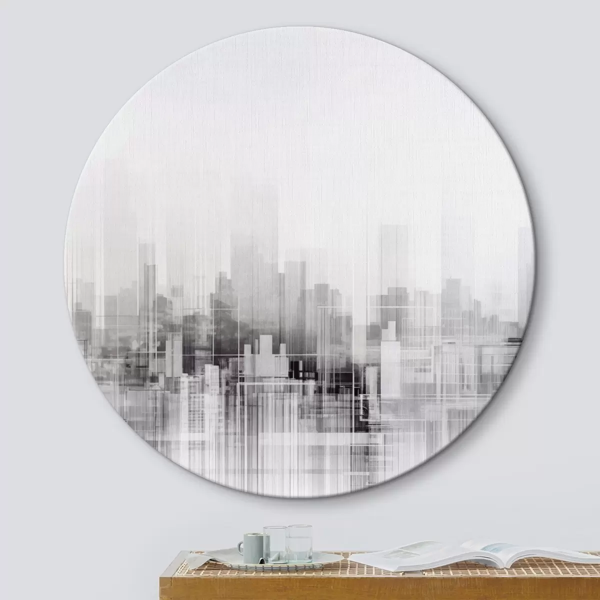 Runde Wandbilder Texturierte minimalistische Stadtlandschaft mit hohen Gebäuden und Wolkenkratzern, die sich gegen einen weißen Himmel abheben Nr r44863
