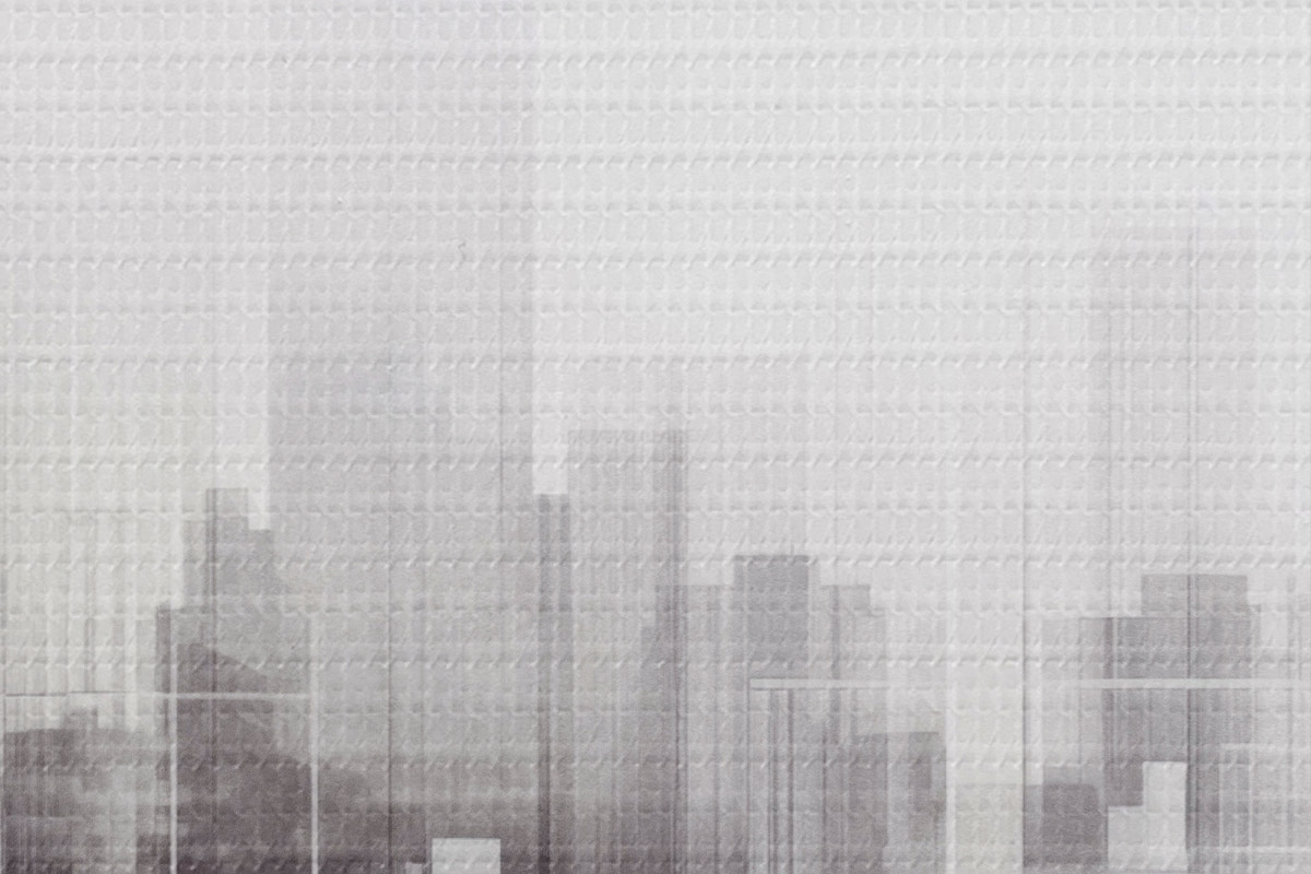 Runde Wandbilder Texturierte minimalistische Stadtlandschaft mit hohen Gebäuden und Wolkenkratzern, die sich gegen einen weißen Himmel abheben r44863