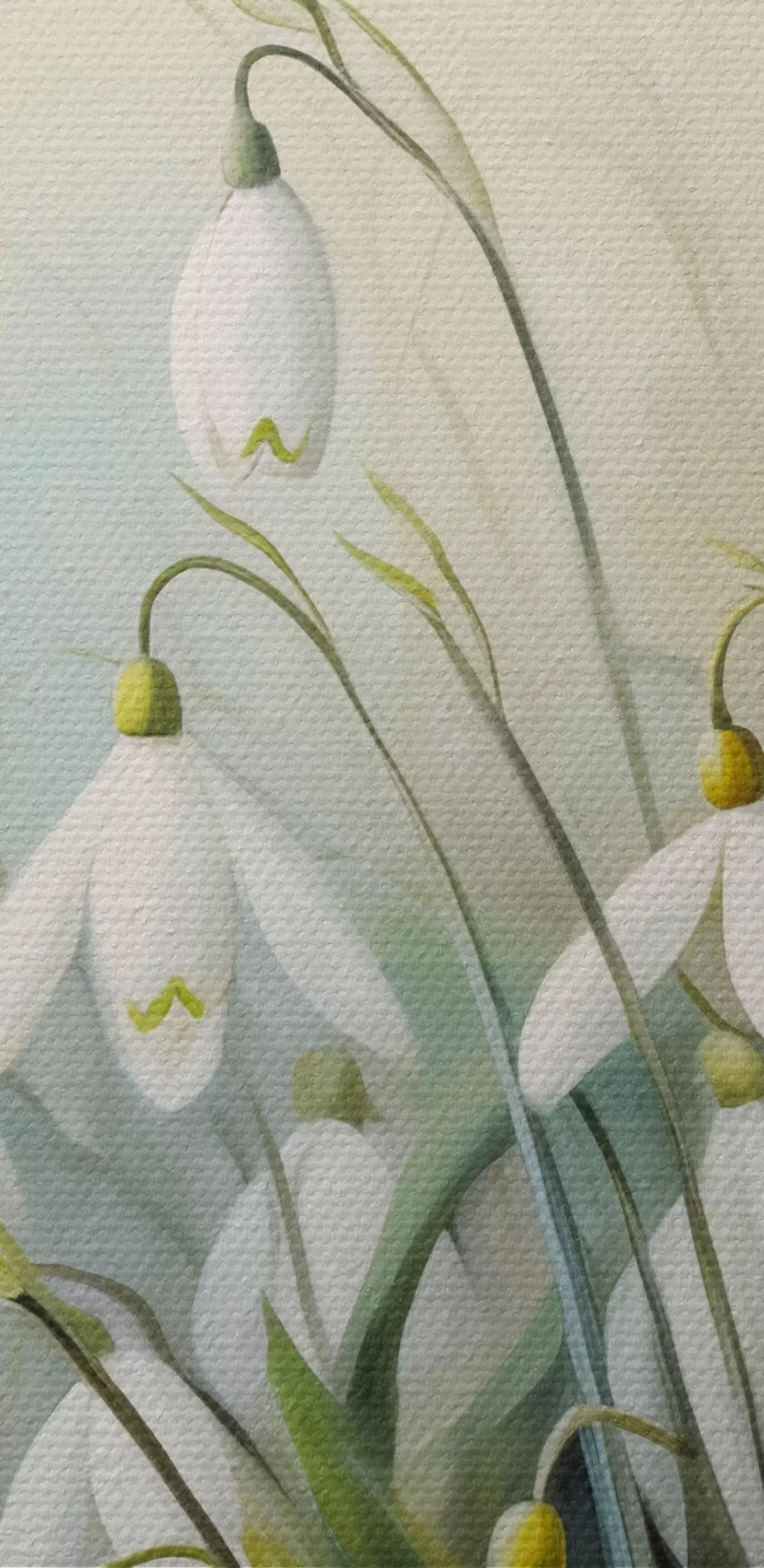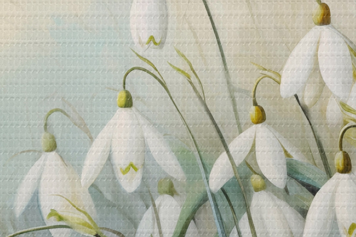 Runde Wandbilder Weiße Schneeglöckchenblüten mit blauen und grünen Stängeln und Blättern, weiche Pinselstriche, unscharfer Hintergrund Nr r44864