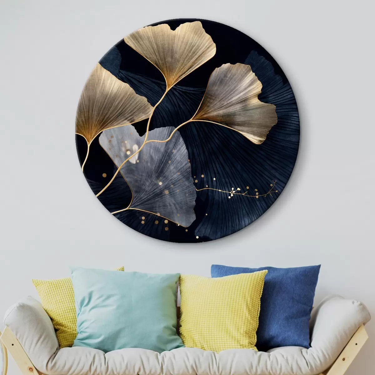 Runde Wandbilder Ginkgoblätter in Gelb- und Blautönen, eleganter dunkler Hintergrund, moderne Kunst, minimalistischer Stil, naturinspiriert Nr r44921