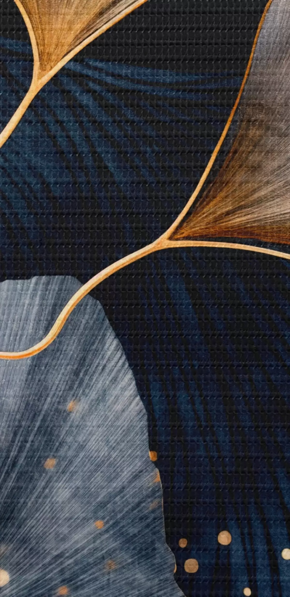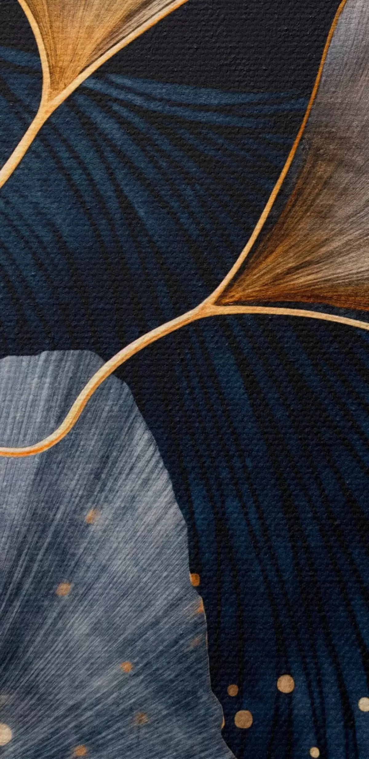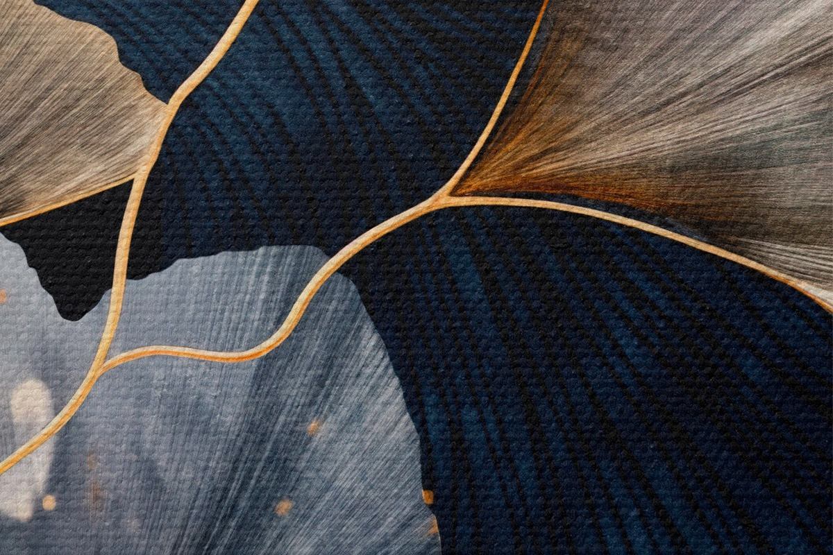Runde Wandbilder Ginkgoblätter in Gelb- und Blautönen, eleganter dunkler Hintergrund, moderne Kunst, minimalistischer Stil, naturinspiriert r44921