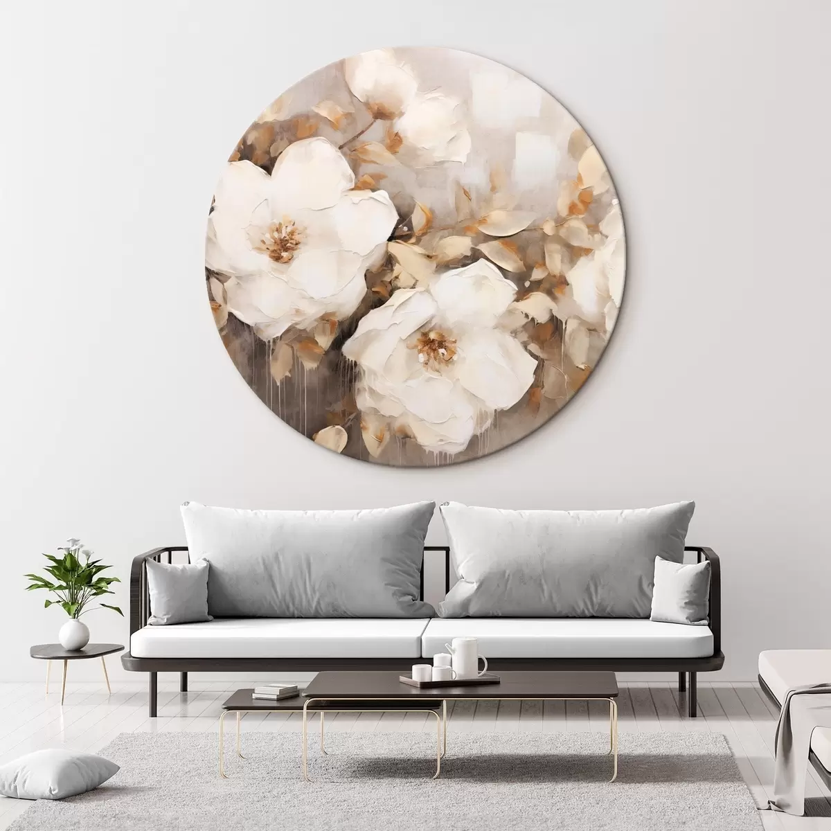 Runde Wandbilder Weiße Blumen mit braunen Blättern in einem beigen Hintergrund, Ölgemälde Nachahmung, Blumenarrangement, botanische Kunst r44922
