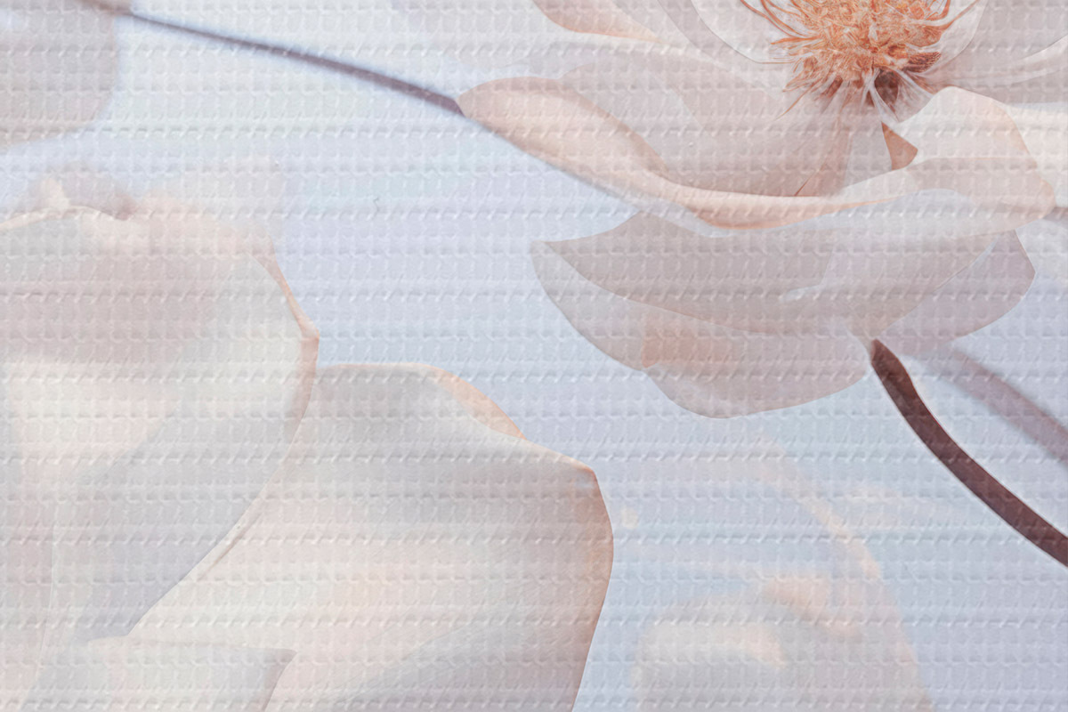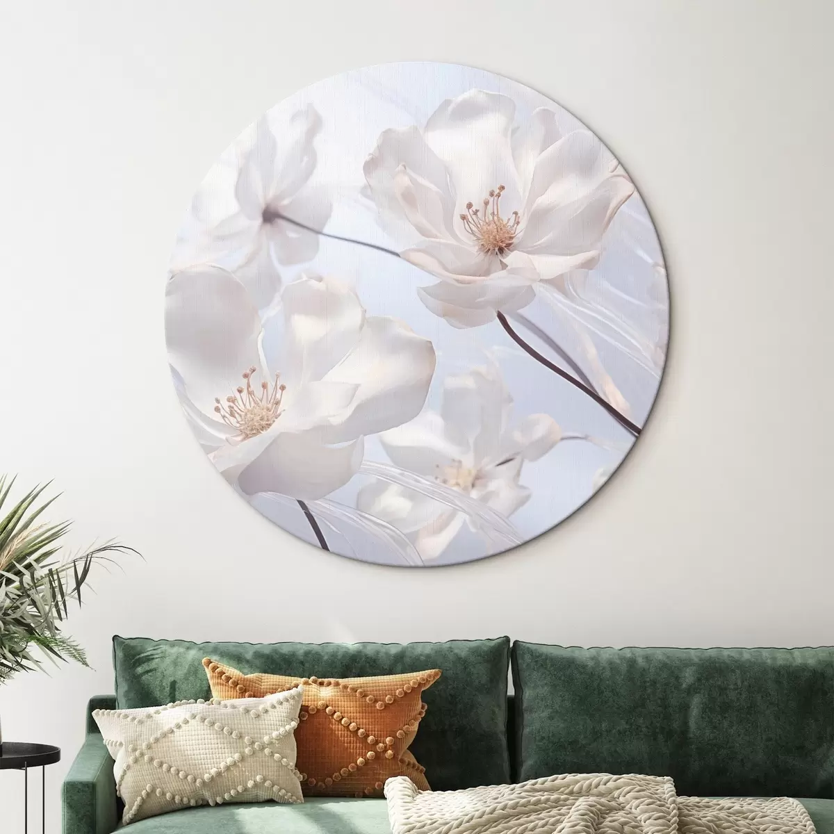 Runde Wandbilder Weiße Blumen mit durchscheinenden Blütenblättern, weicher hellblauer Hintergrund, elegant, romantisch, zart, verträumt Nr r44931