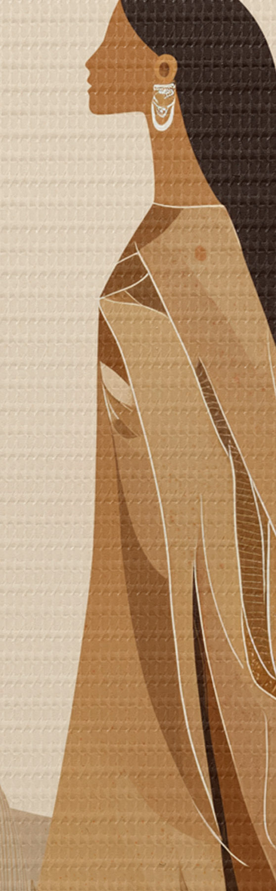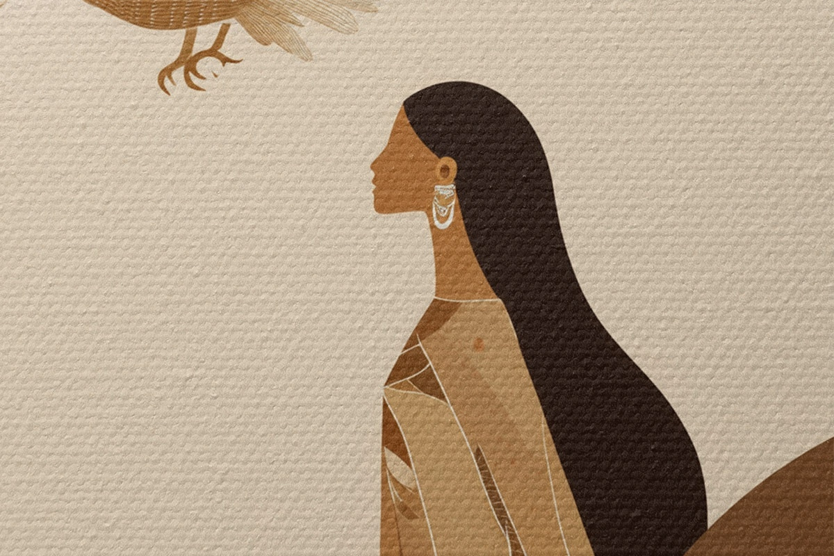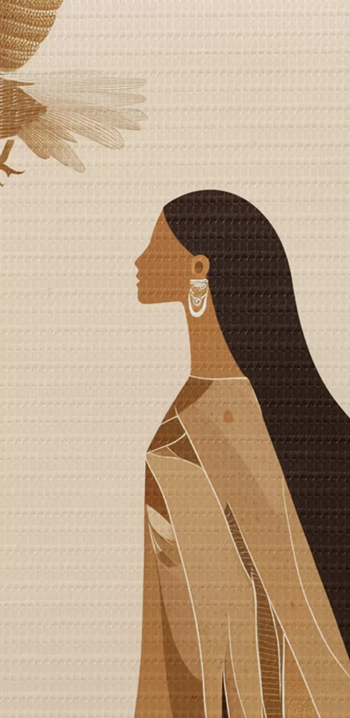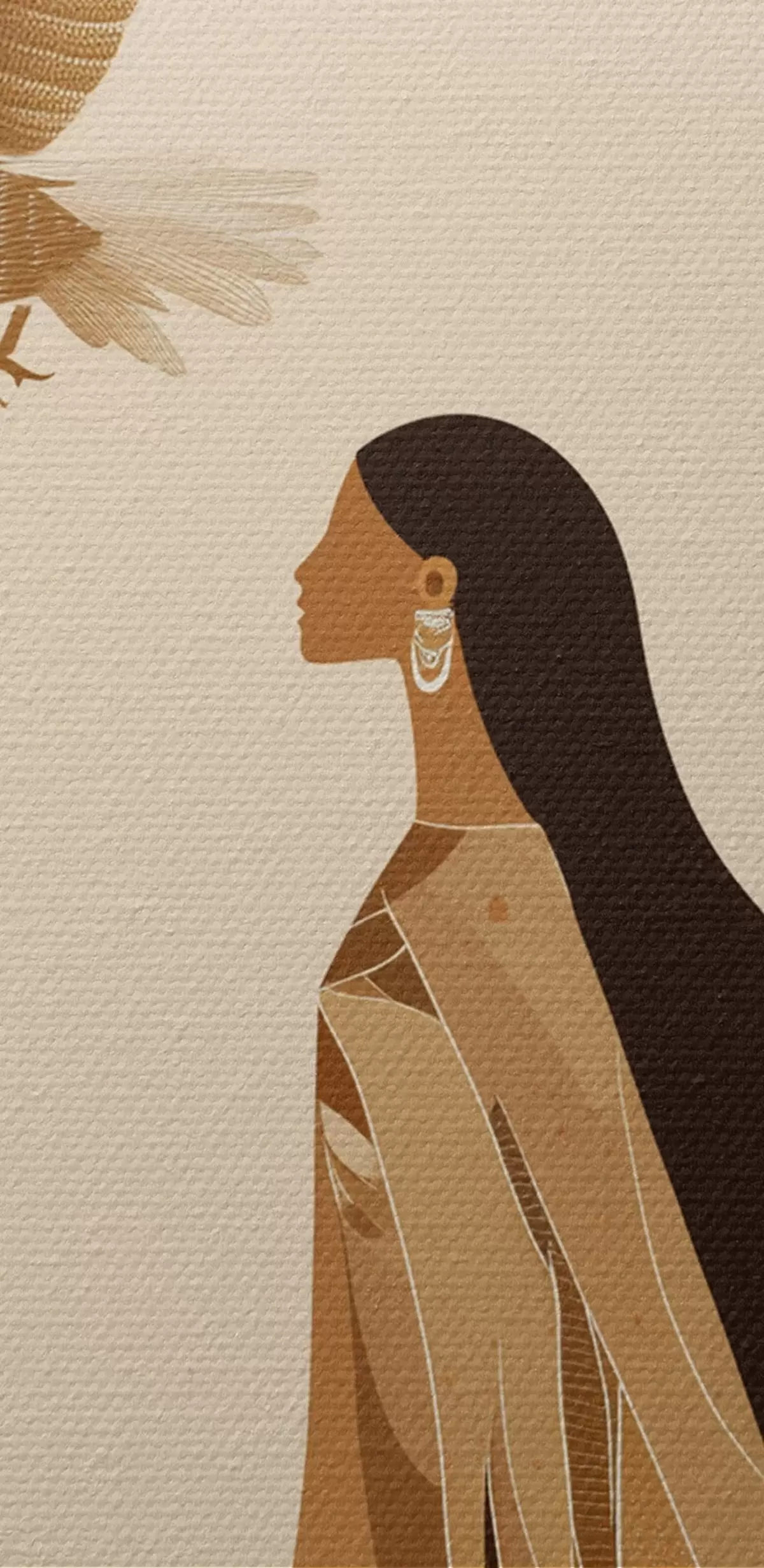 Runde Wandbilder Abstraktion mit Frau und Adler in den Himmel, beige Farben r44978