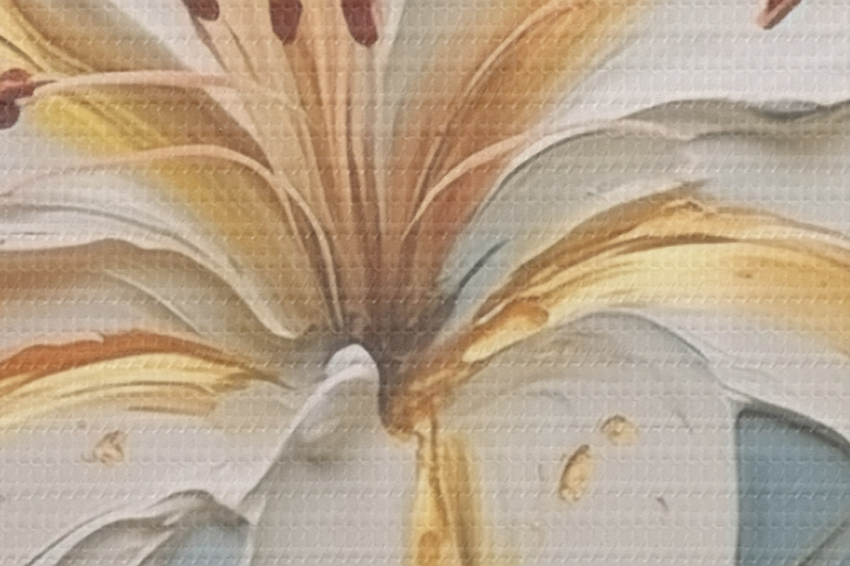 Drei Materialtypen stehen zur Verfügung: Economic Canvas - ein dichtes und haltbares Material für den Digitaldruck, identisch mit Malerleinwand, wasserfeste Oberfläche, realistische Wiedergabe von Details, mittelkörniges Material. Premium Canvas - die Textur ähnelt der einer Malerleinwand (verwobene kleine Fäden). Weiche, detaillierte Wiedergabe des Bildes auf einer matten Oberfläche. Eco-Premium - hochwertiges Gewebe aus 100% Baumwolle. Dank der natürlichen Baumwollfasern ist das Material langlebig und verschleißfest. Hervorragende Farbwiedergabe und Detailtreue.