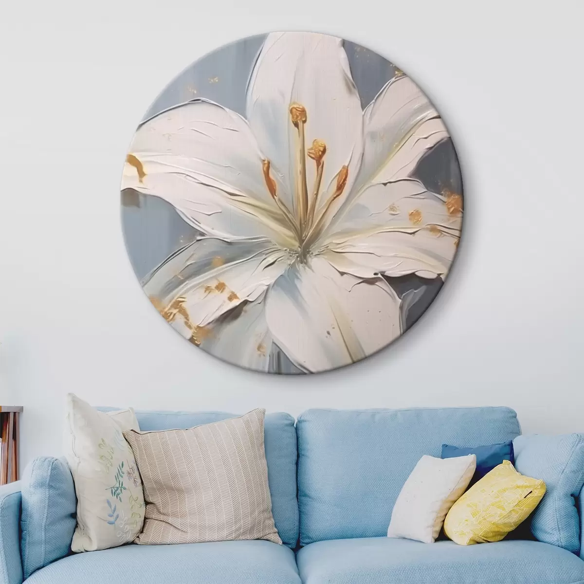 Runde Wandbilder Weiße Lilie mit gelben Akzenten auf blauem Hintergrund r45078
