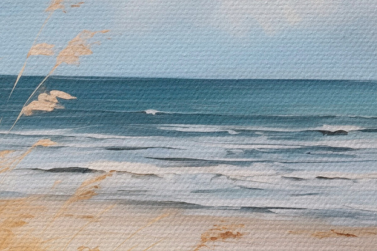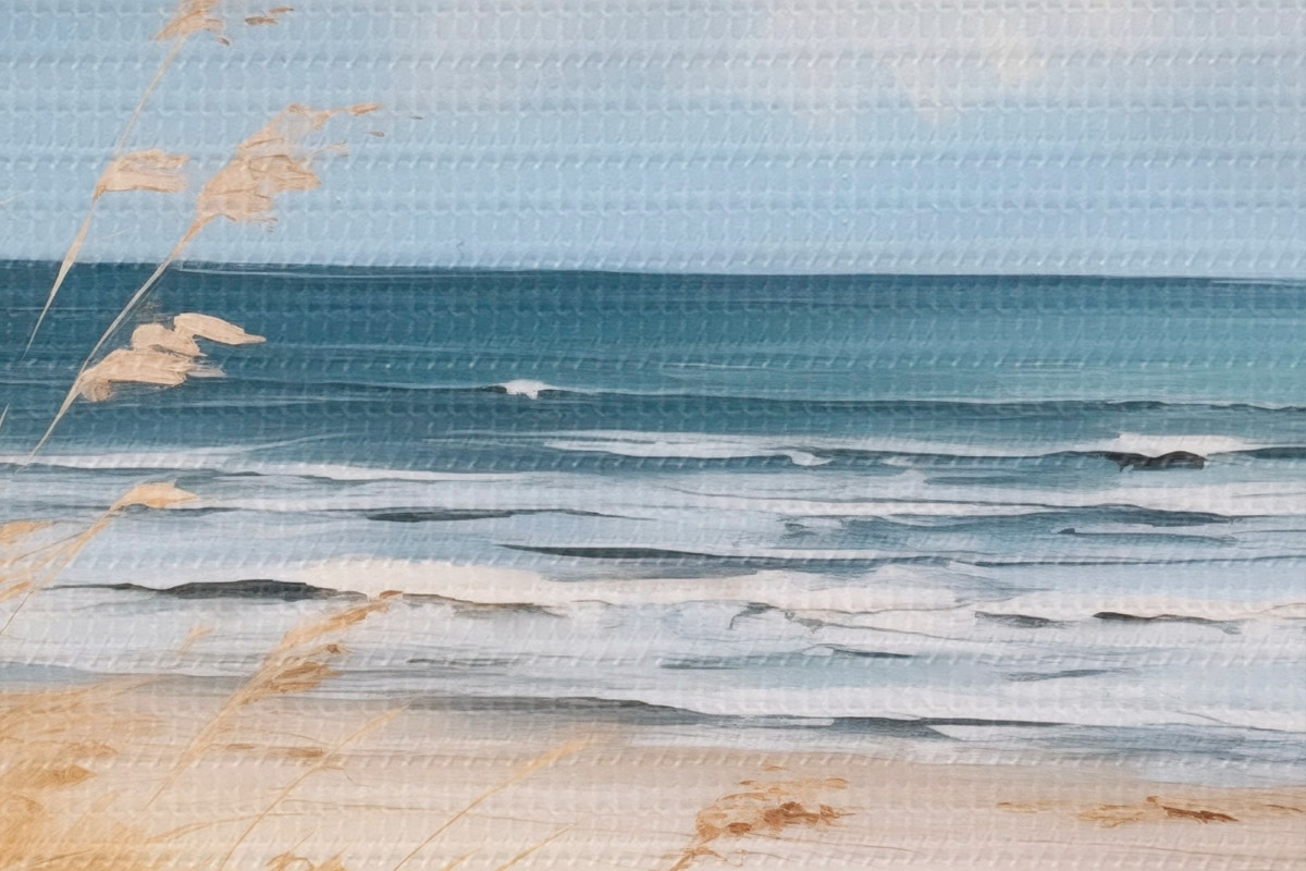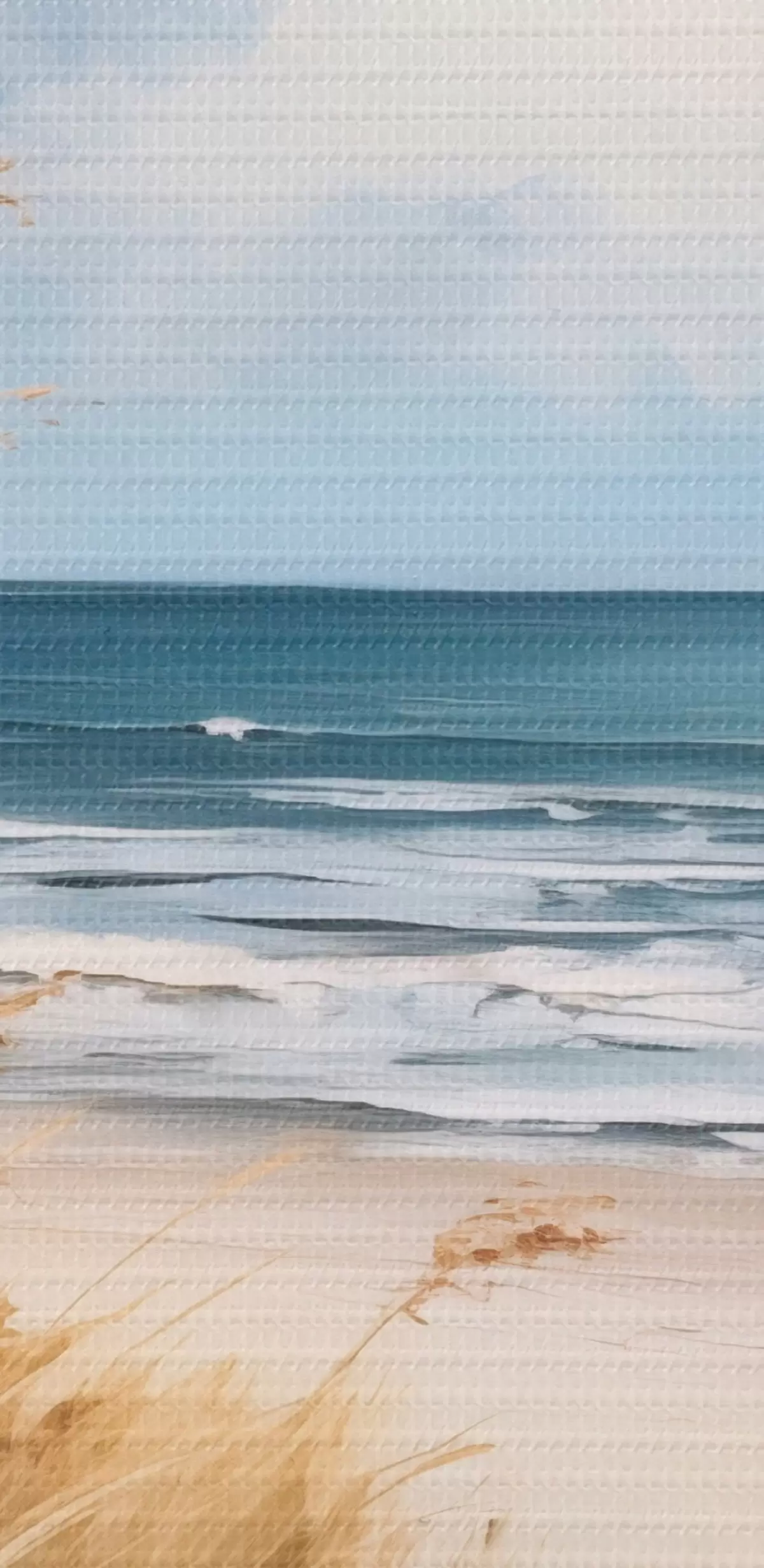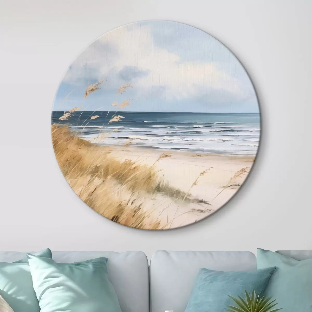 Runde Wandbilder Ein Sandstrand mit hohem Gras im Vordergrund, das Meer mit Wellen und ein bewölkter Himmel im Hintergrund Nr r45174