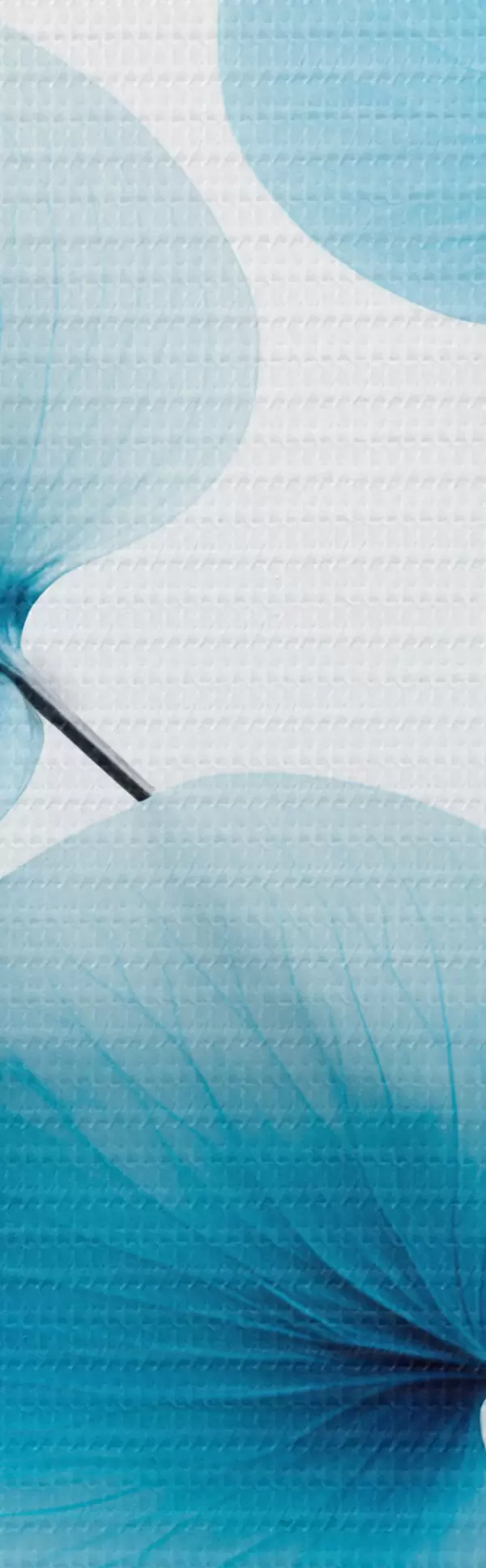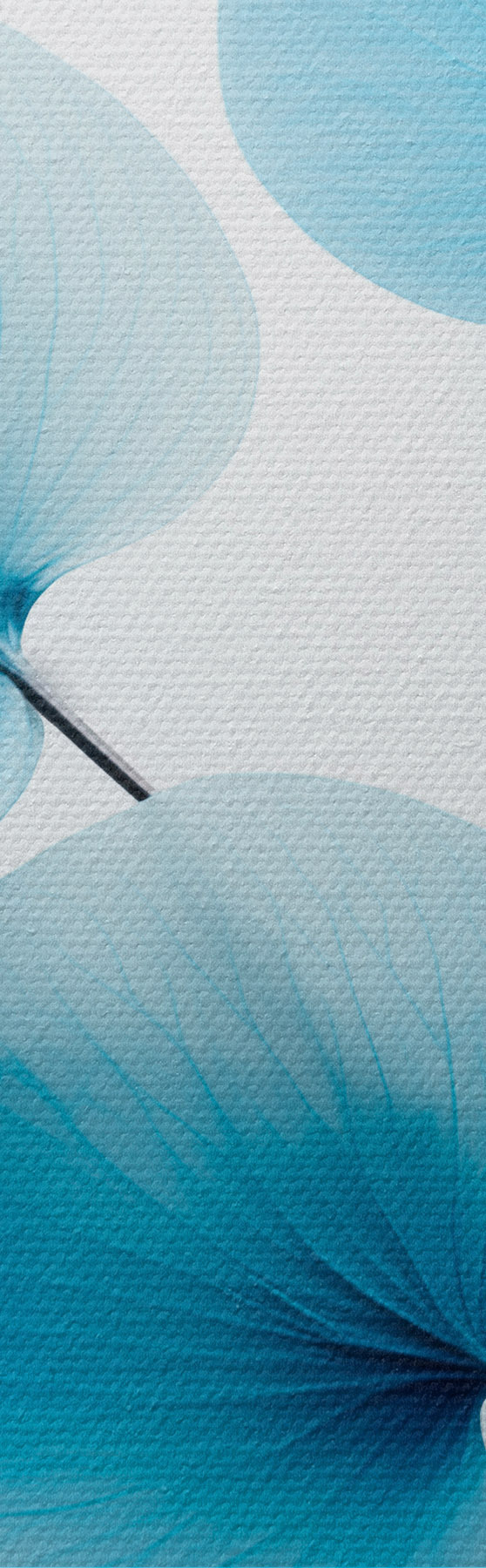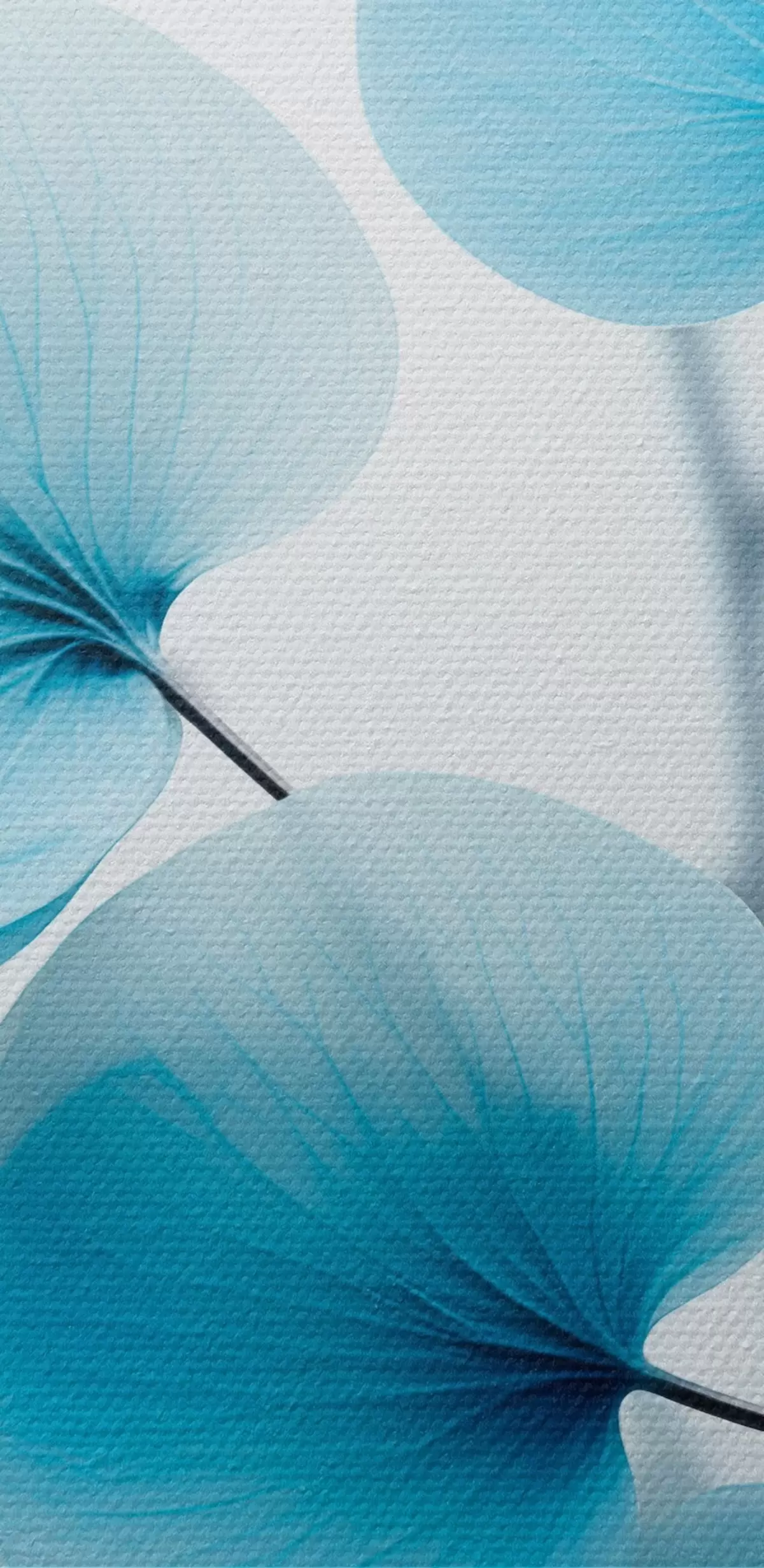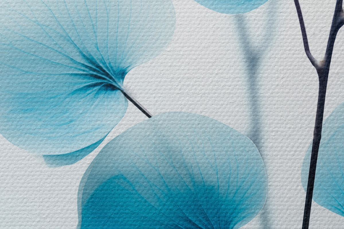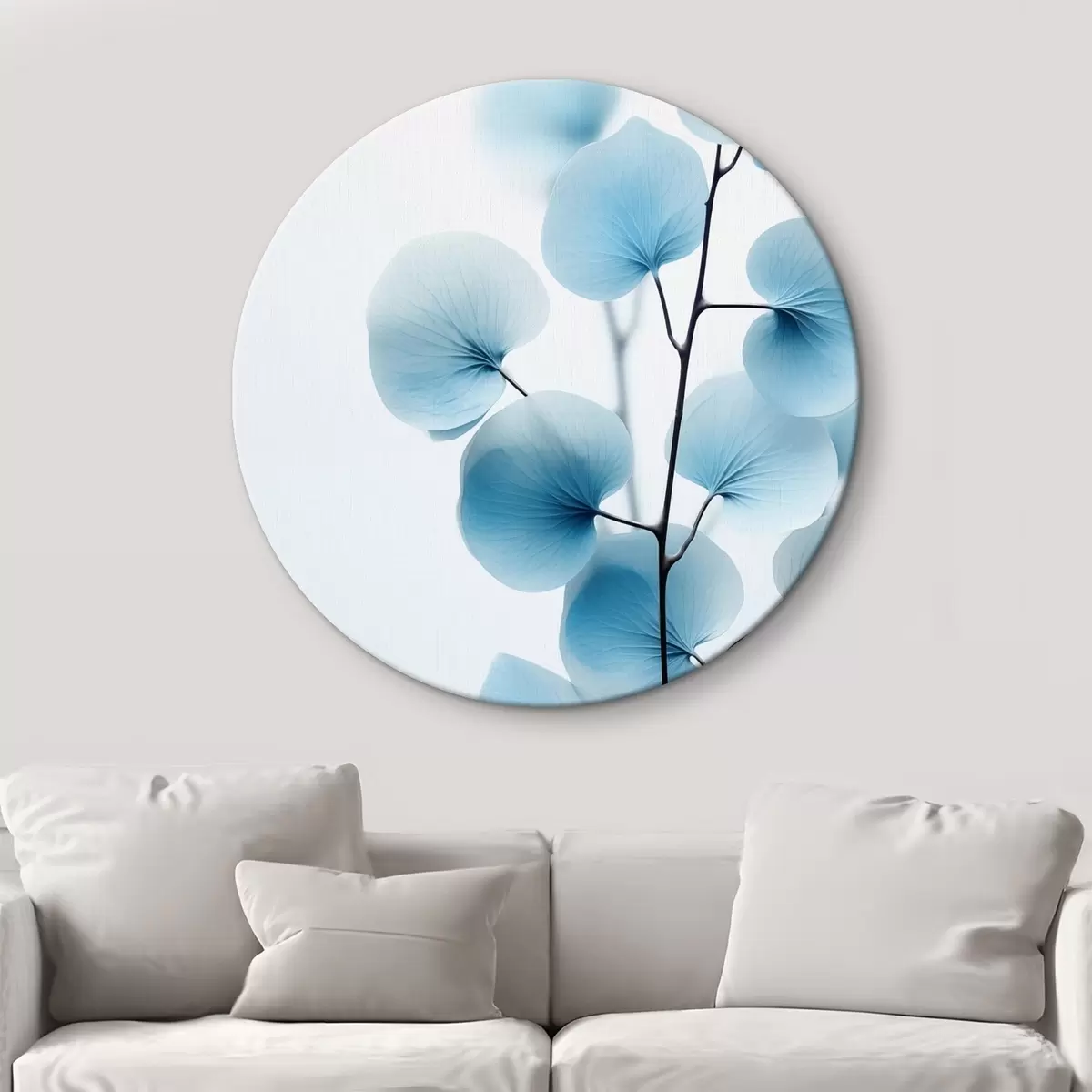 Runde Wandbilder Zweig mit durchscheinenden blauen Blättern, zarte Adern sichtbar, leichte und ruhige Komposition, minimalistische Ästhetik r45176