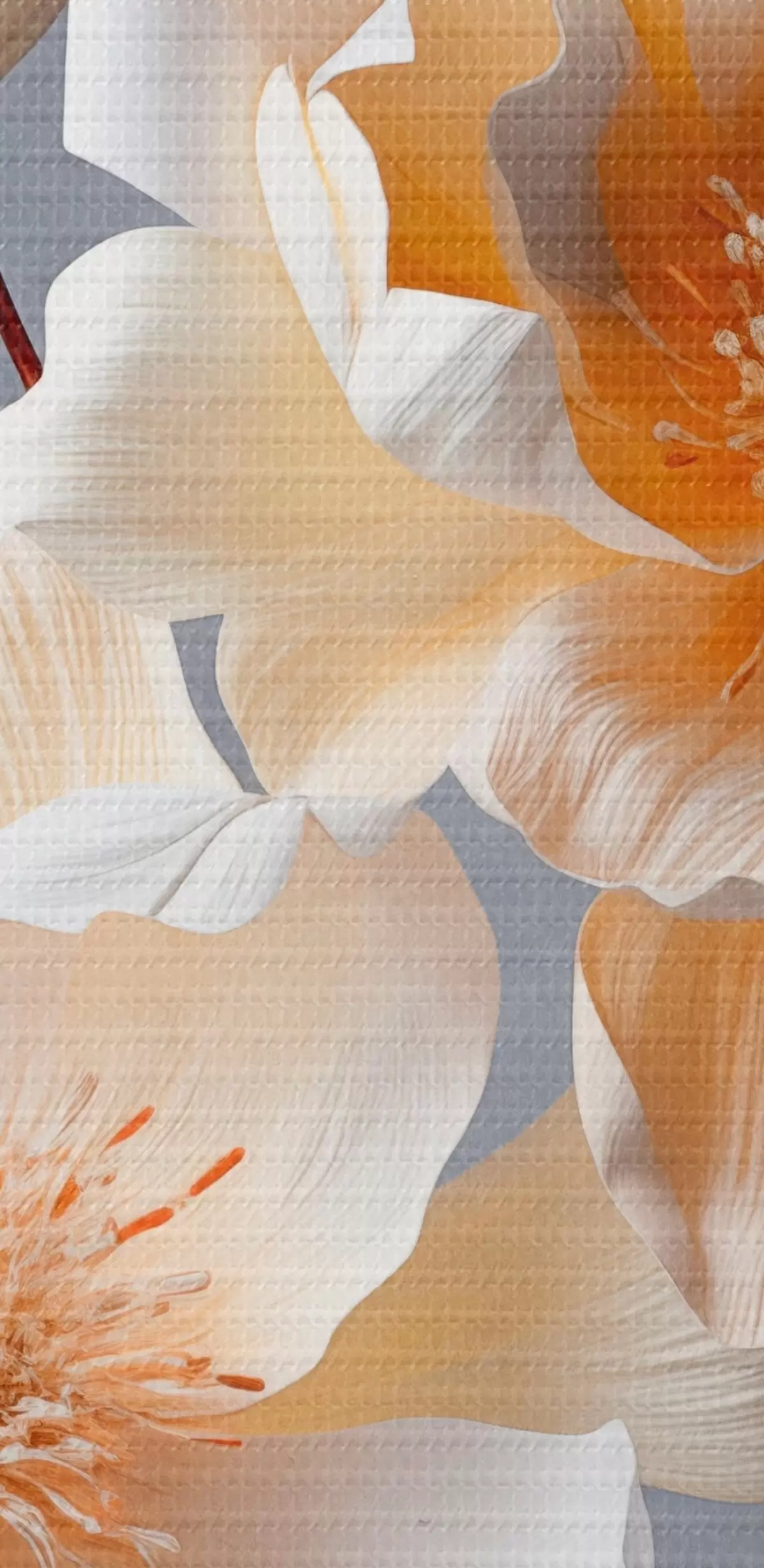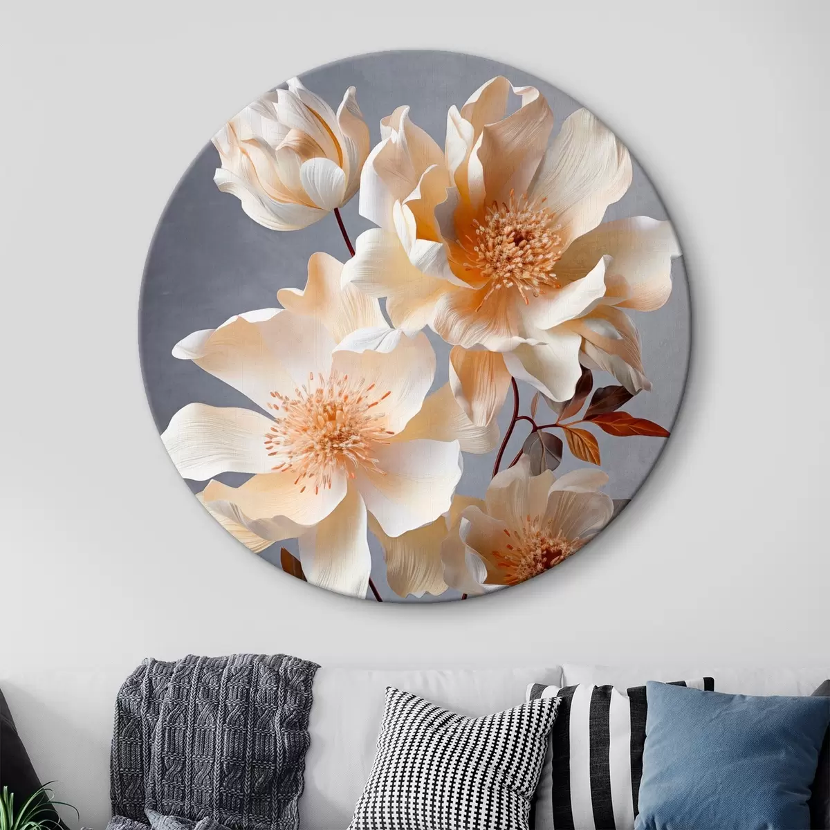 Runde Wandbilder Texturierte Blumen mit orangefarbenen Blütenstempeln und orangefarbenen Blättern auf grauem Hintergrund, weiches Licht, elegant, detailliert, realistisch Nr r45181