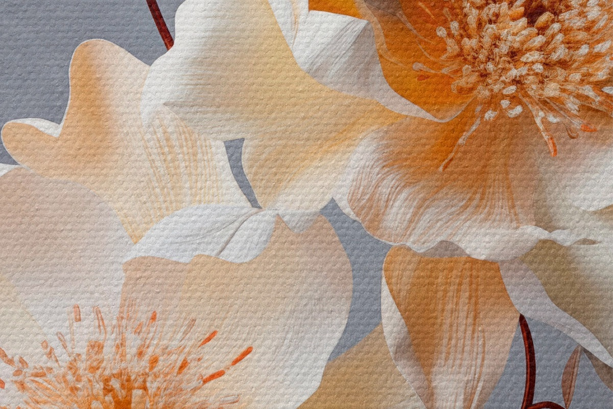 Runde Wandbilder Texturierte Blumen mit orangefarbenen Blütenstempeln und orangefarbenen Blättern auf grauem Hintergrund, weiches Licht, elegant, detailliert, realistisch r45181