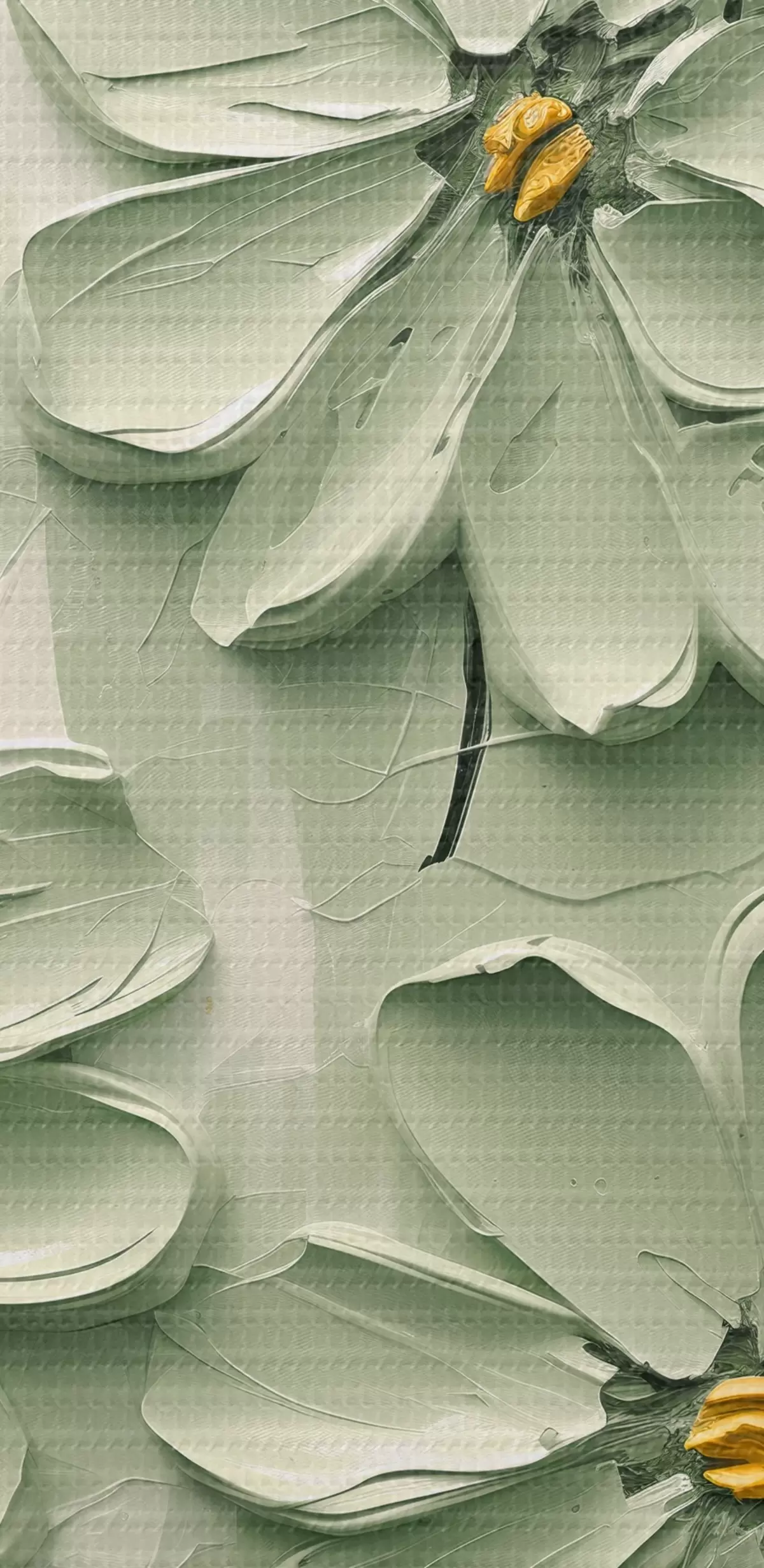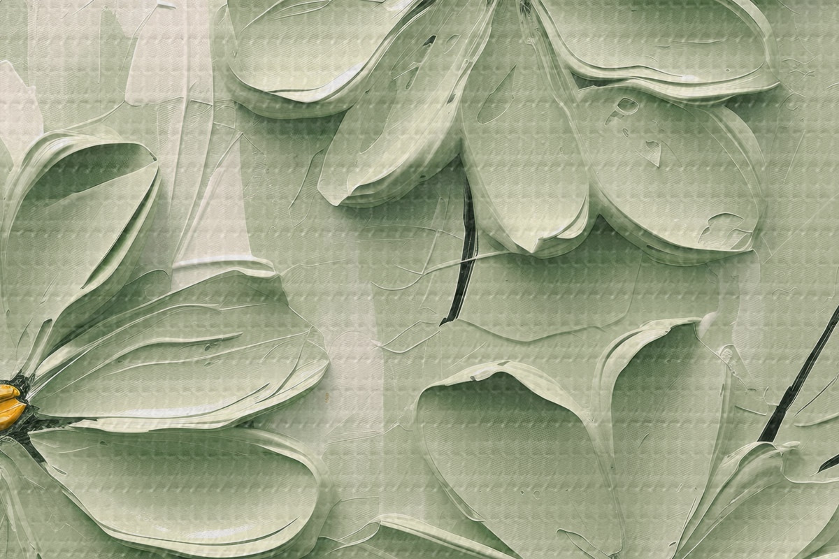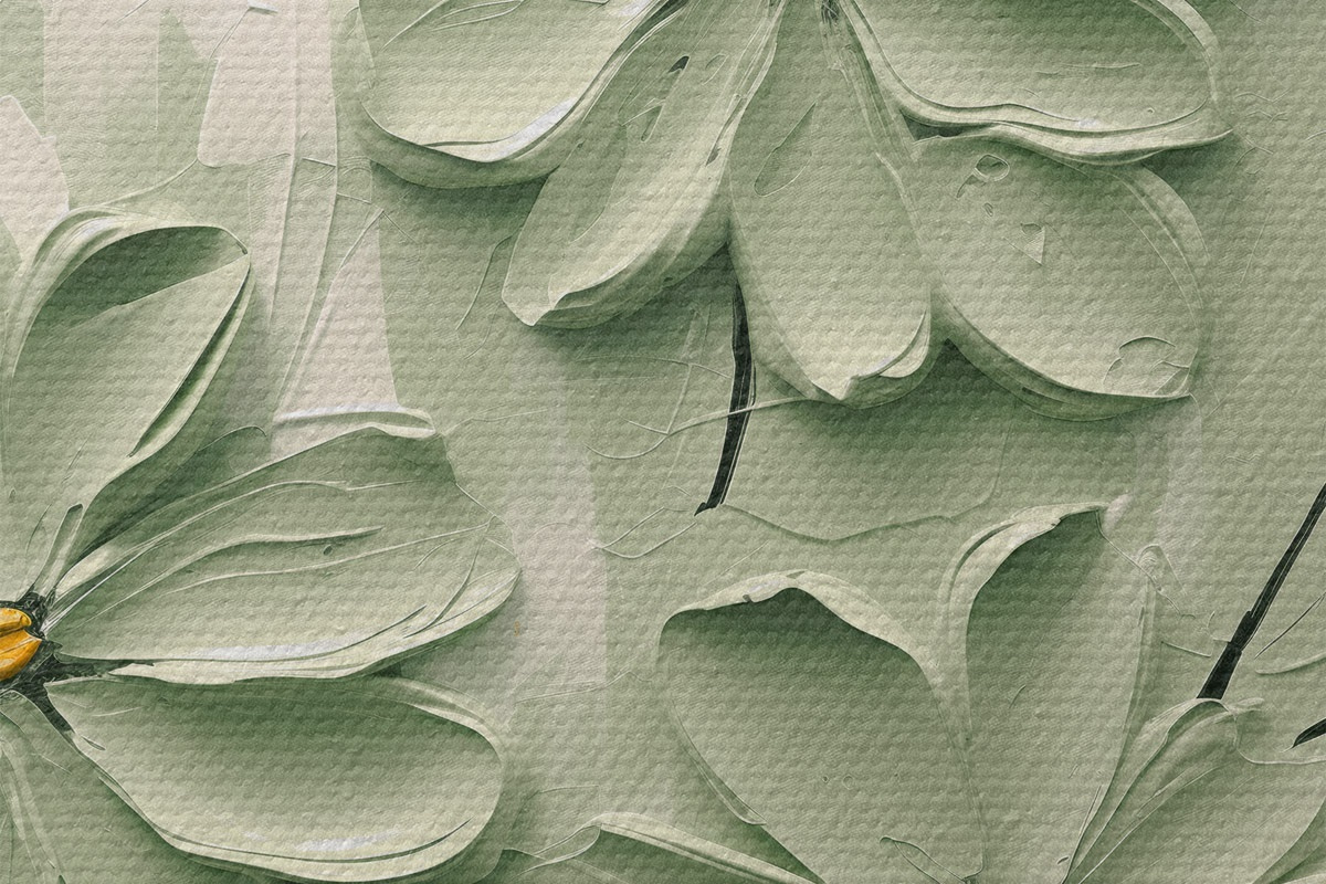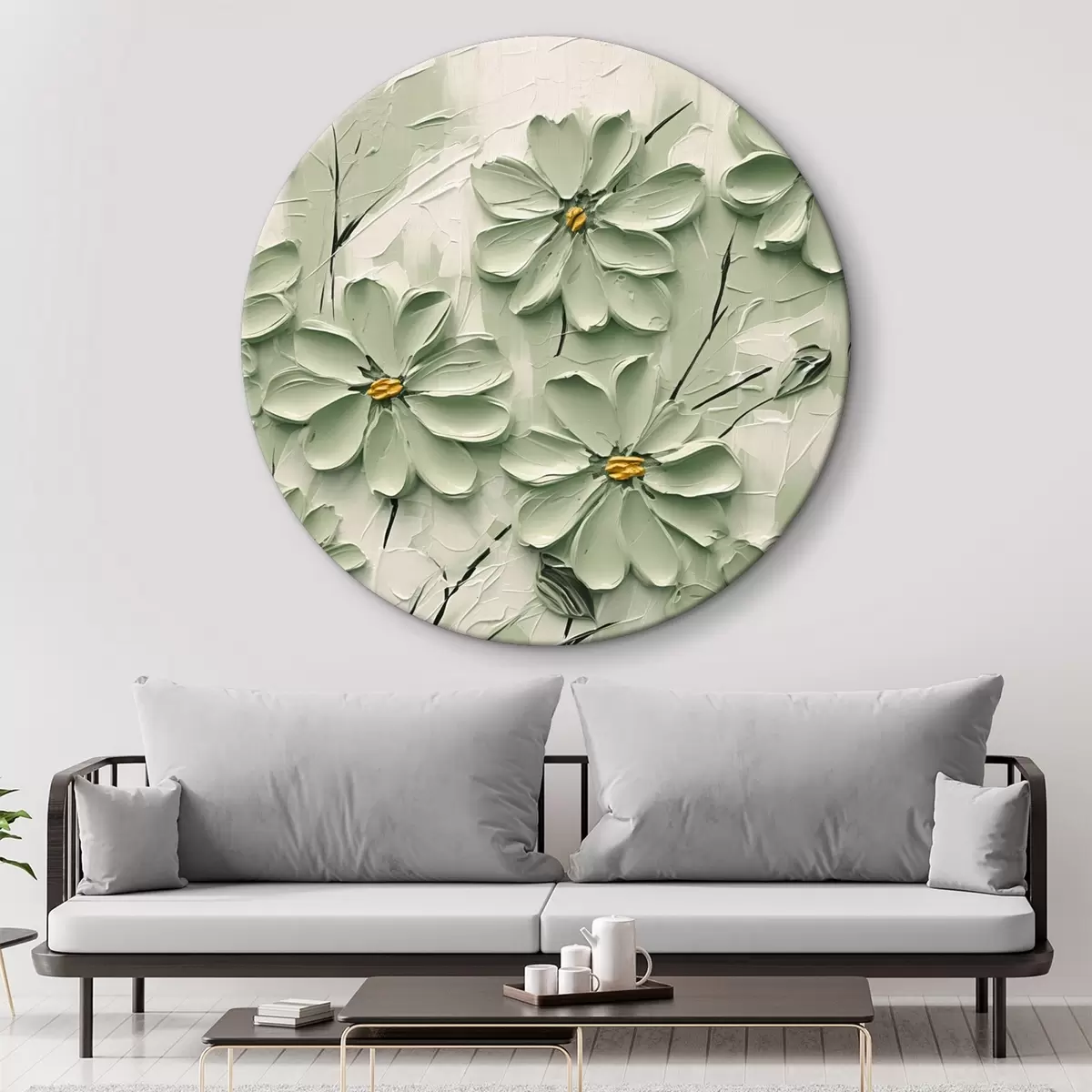 Runde Wandbilder Grüne Blumen mit gelben Zentren gemalt in dicken Pinselstrichen auf einem hellen Hintergrund Nr r45265
