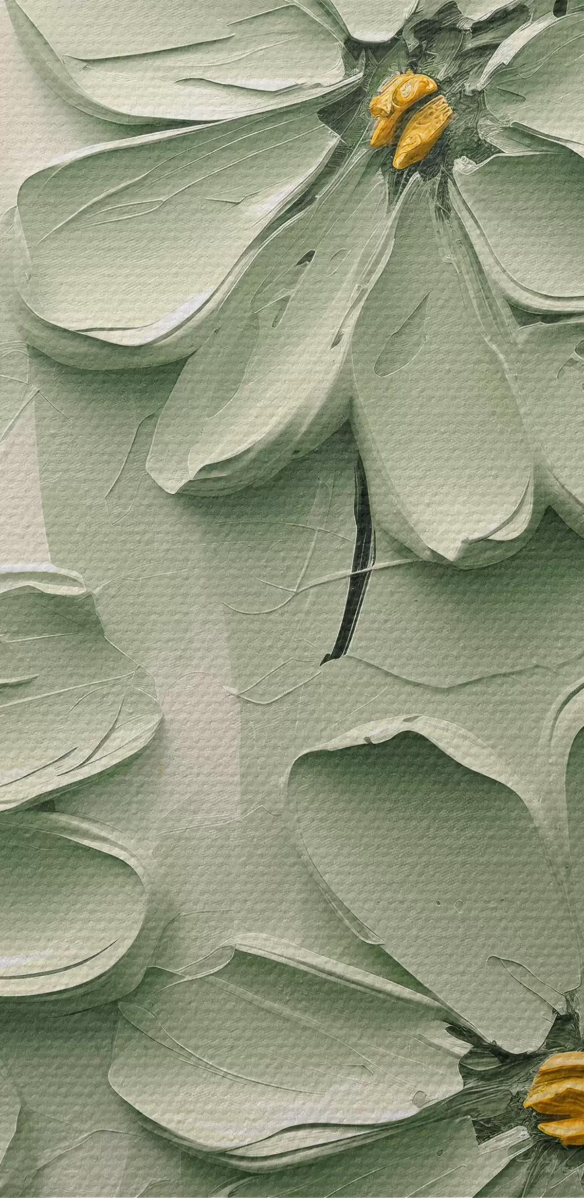 Runde Wandbilder Grüne Blumen mit gelben Zentren gemalt in dicken Pinselstrichen auf einem hellen Hintergrund r45265