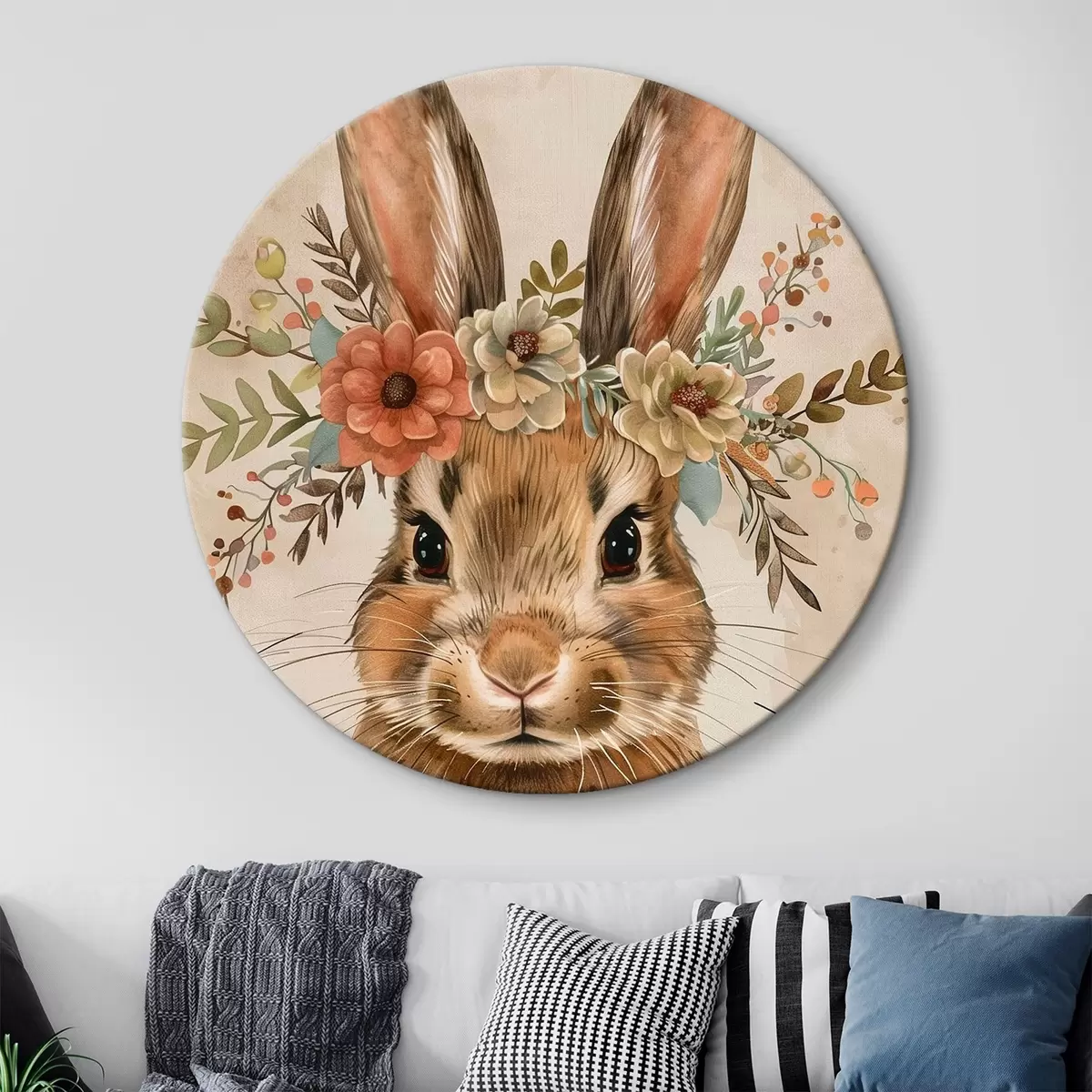 Runde Wandbilder Niedlicher Hase mit Blumen im Aquarellstil r45332