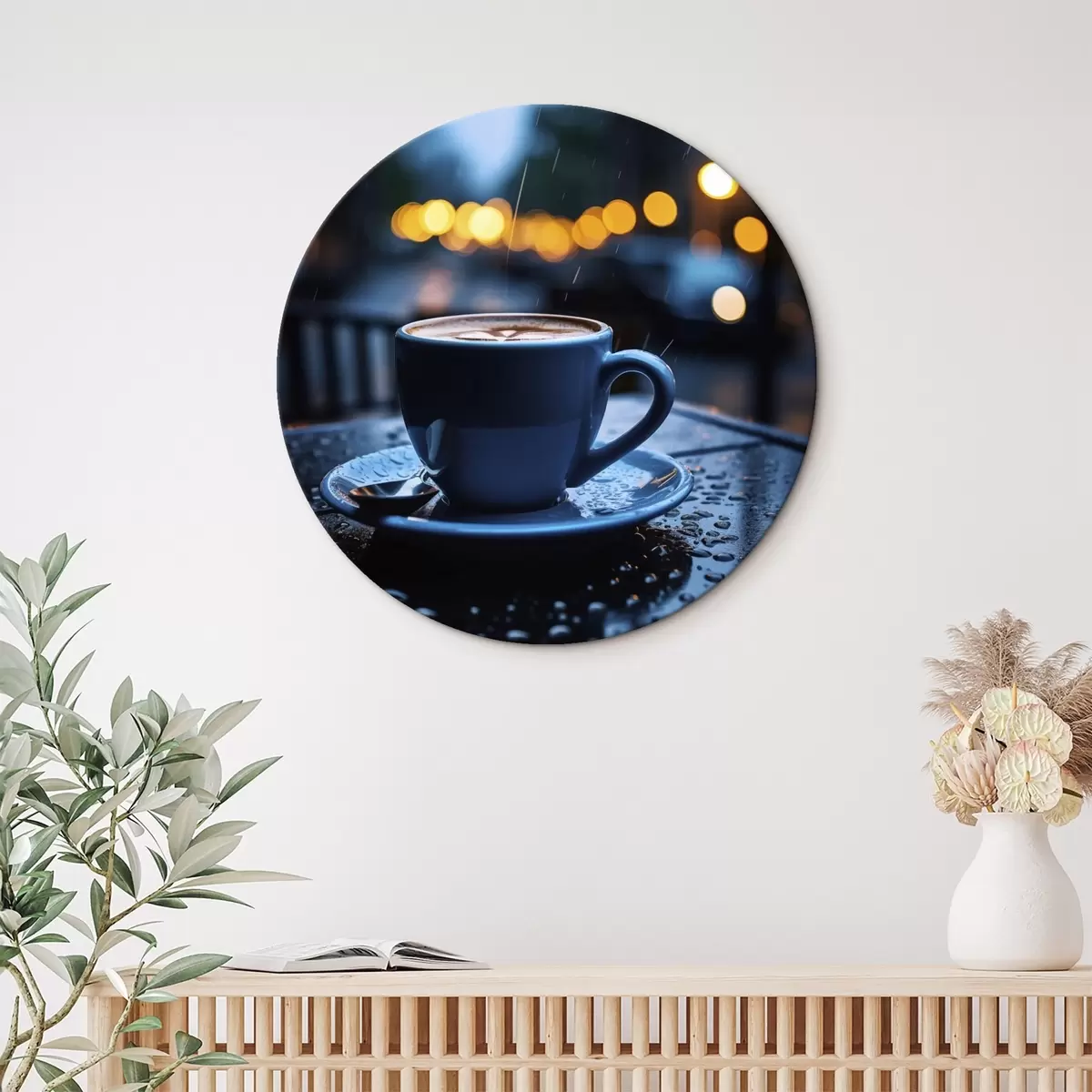 Runde Wandbilder Eine Tasse Kaffee auf dem Tisch im Regen Nr r45497