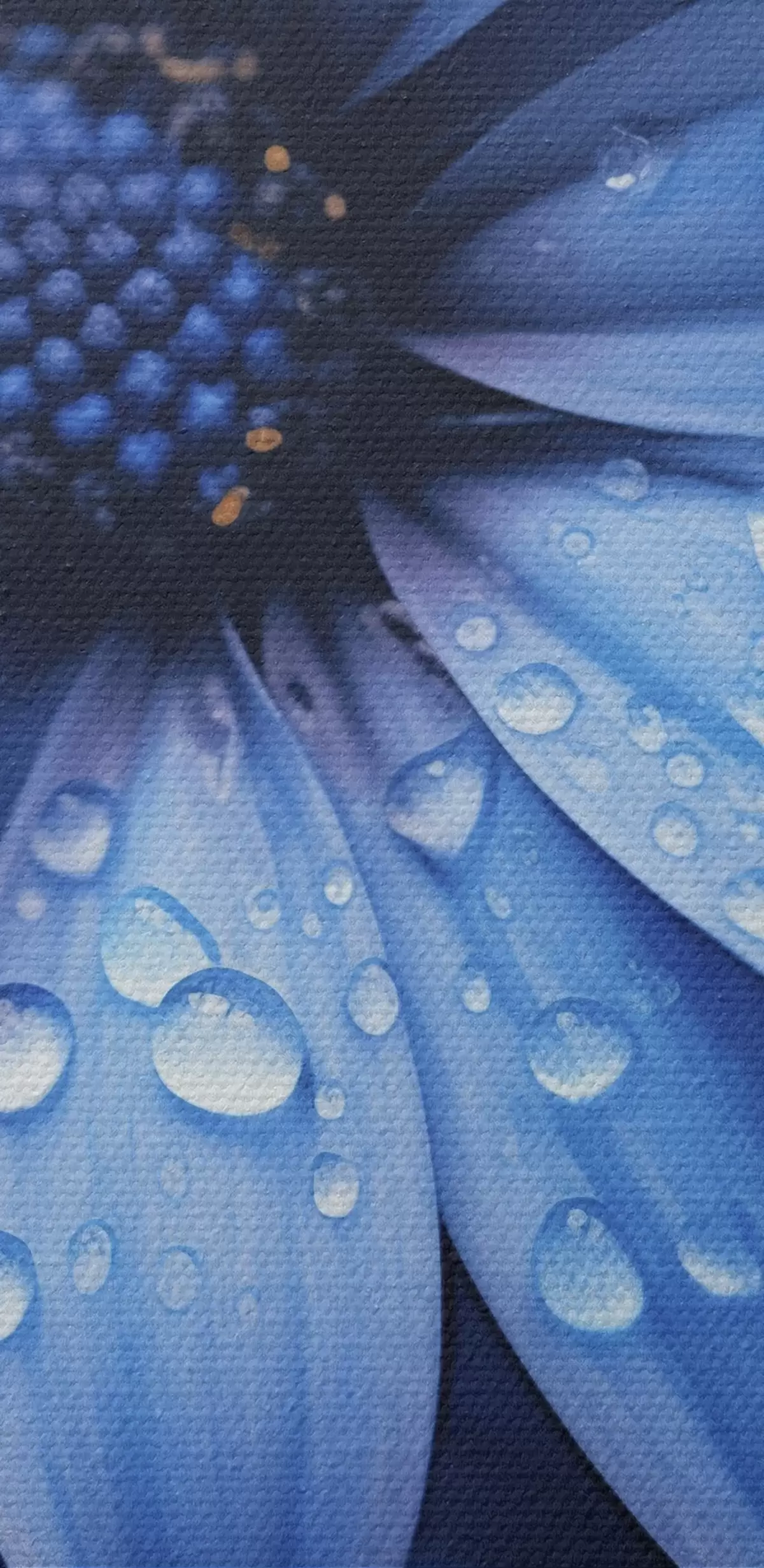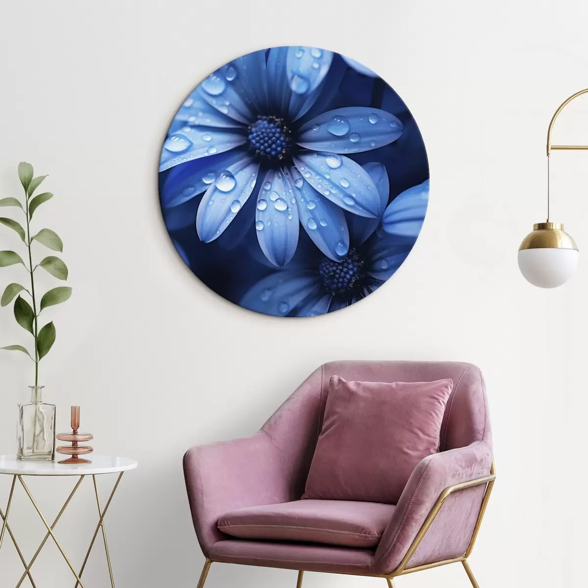 Runde Wandbilder Blaue Blume mit Wassertropfen auf ihren Blütenblättern r45499