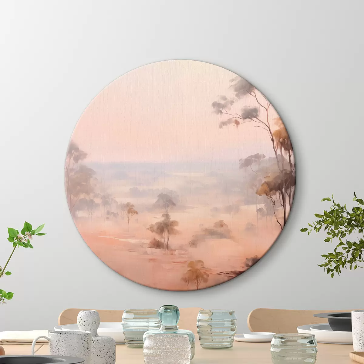 Runde Wandbilder Eine Landschaft mit Sträuchern und Bäumen in Pastelltönen von Rosa, Orange und Braun, mit Bergen im Hintergrund Nr r45554