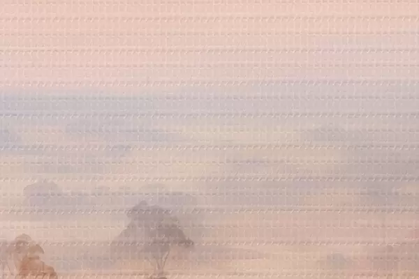 Runde Wandbilder Eine Landschaft mit Sträuchern und Bäumen in Pastelltönen von Rosa, Orange und Braun, mit Bergen im Hintergrund Nr r45554