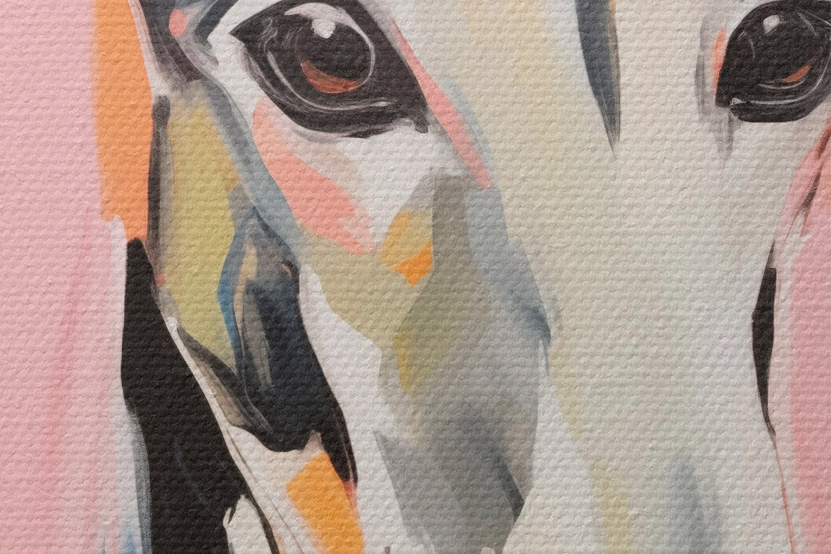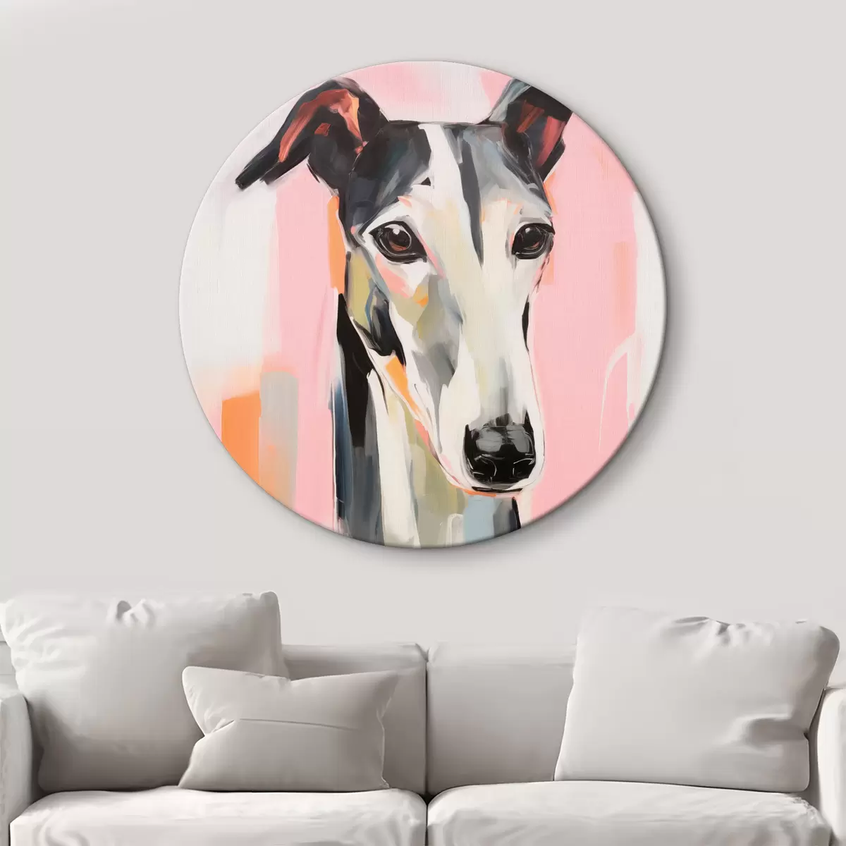 Runde Wandbilder Ein Windhund vor einem Hintergrund aus rosa, orangefarbenen und weißen Pinselstrichen r45566
