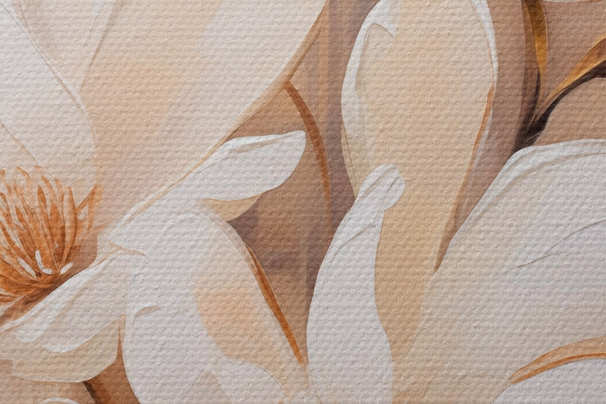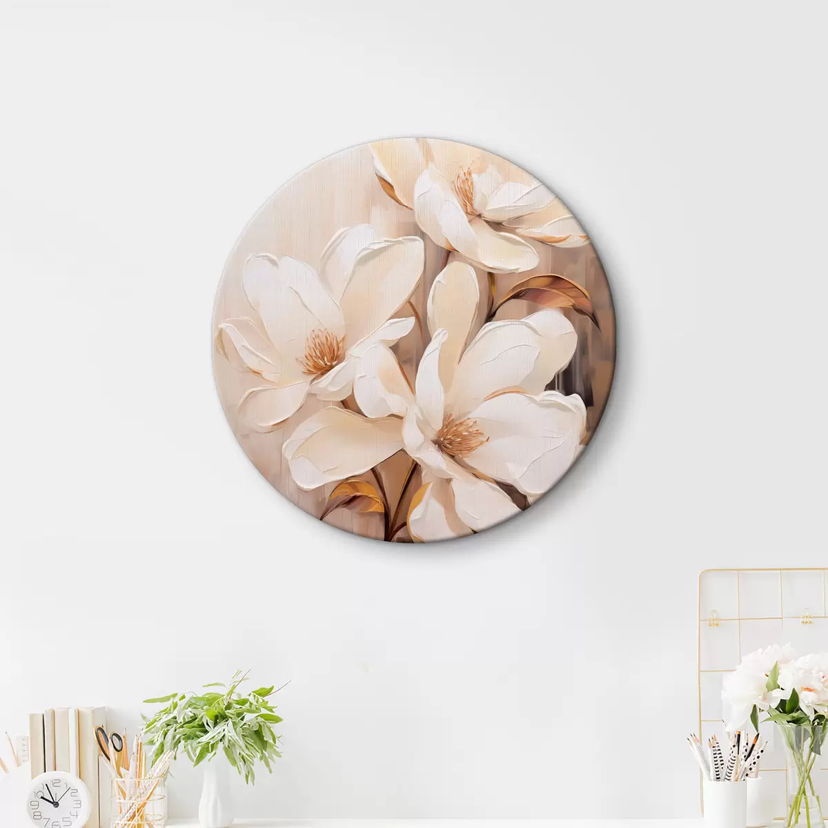 Runde Wandbilder Weiße Magnolienblüten vor einem weichen, verschwommenen Hintergrund aus Beige- und Brauntönen, elegante Blumenkomposition r45571