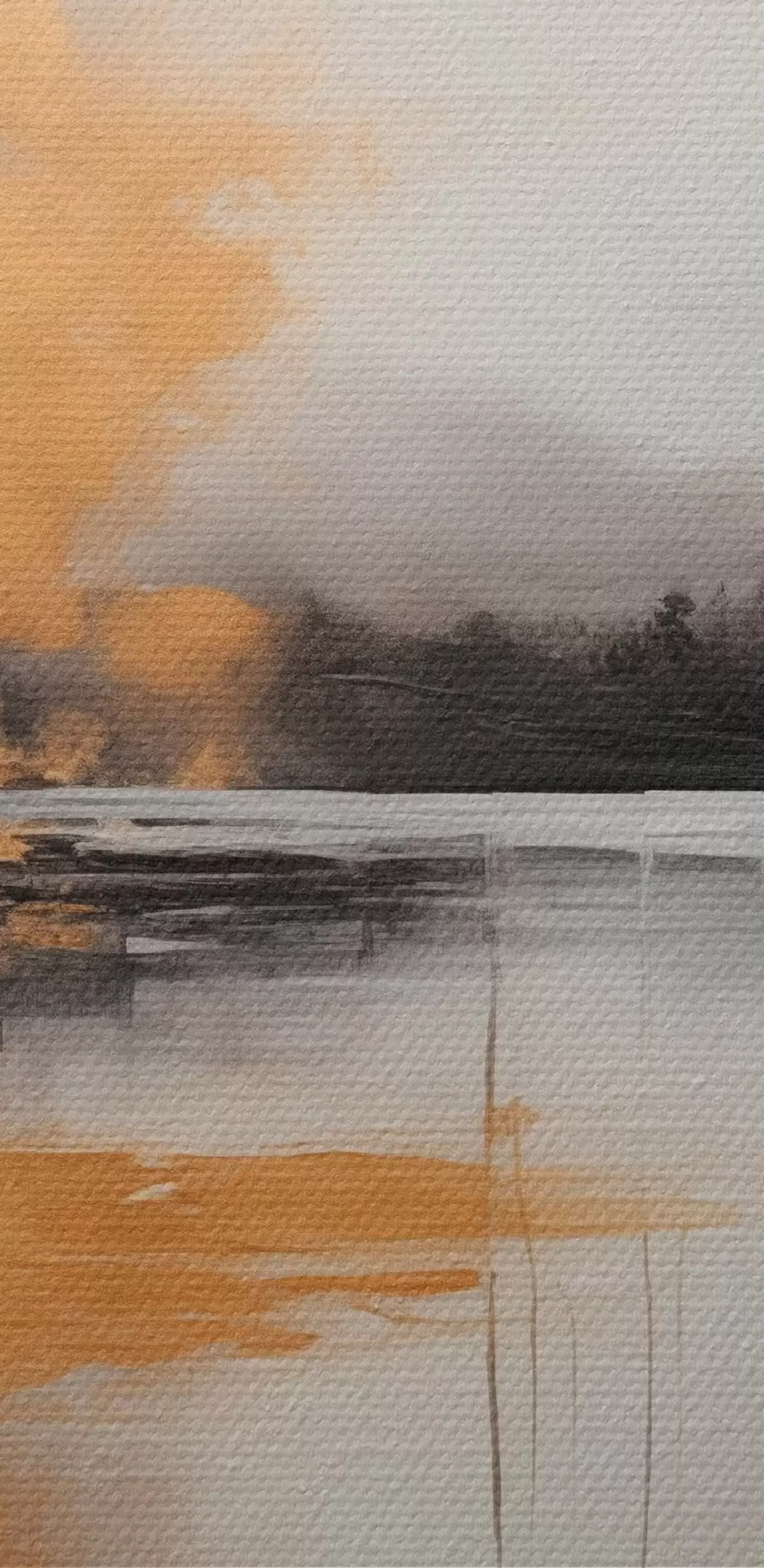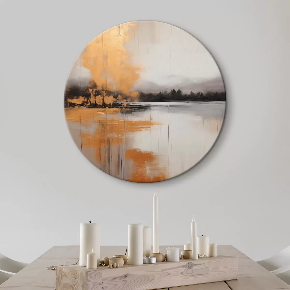 Runde Wandbilder Eine abstrakte Landschaft mit einem See, Baum und gelben Nebel, das Wasser spiegelt und bewölkten Himmel Nr r45575
