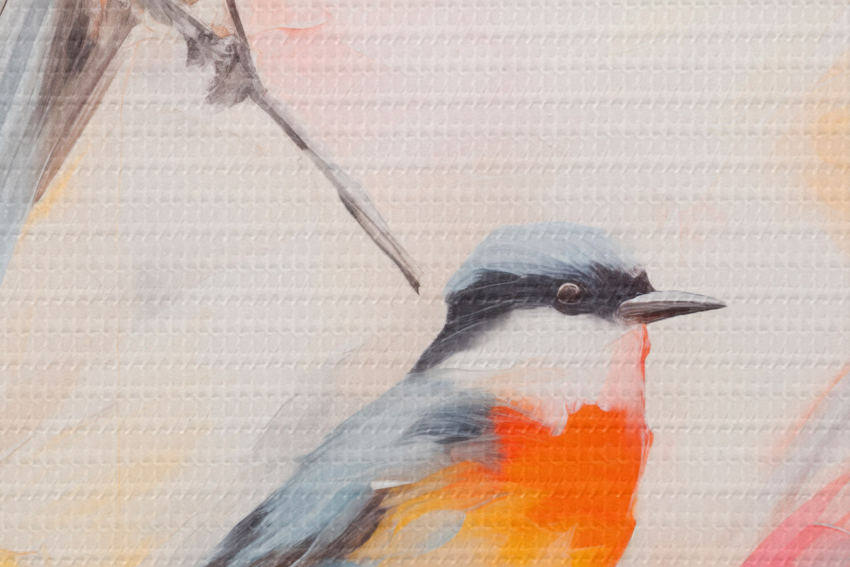 Runde Wandbilder Vögel auf Zweigen, weiche Pastellfarben, heller Hintergrund mit rosa und weißen Farbtönen r45577