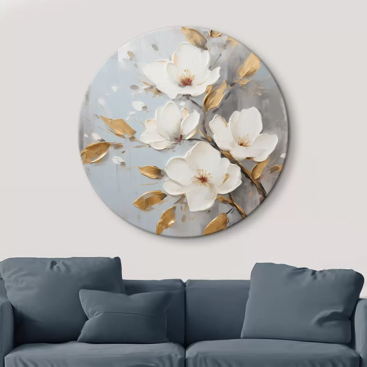 Runde Wandbilder Zweig mit weißen Blüten und gelb-orangefarbenen Blättern Nr r45692