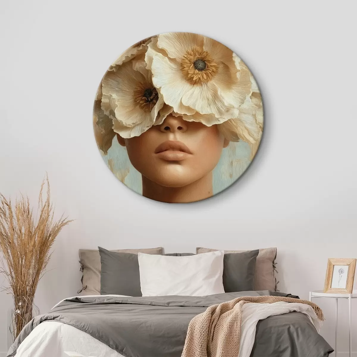 Runde Wandbilder Porträt mit beigen Blumen, die die Augen bedecken Nr r45870