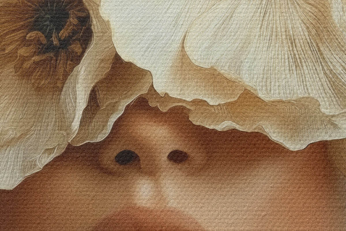 Runde Wandbilder Porträt mit beigen Blumen, die die Augen bedecken r45870