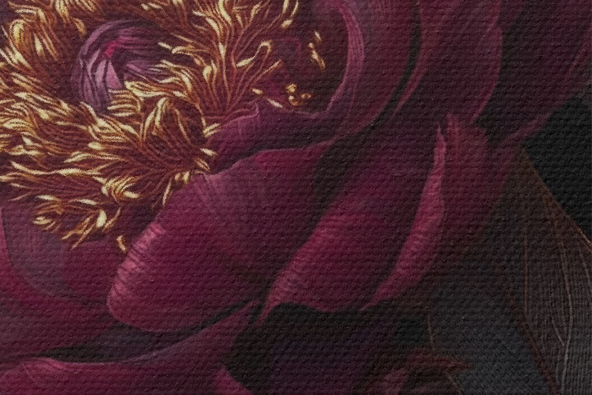 Runde Wandbilder Burgunderrote Pfingstrosen auf schwarzem Hintergrund mit gelben Akzenten r45877