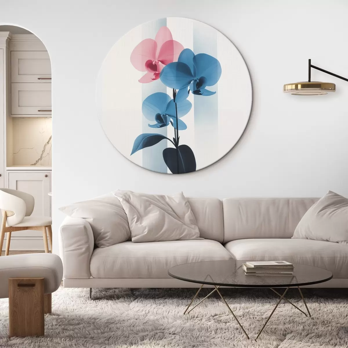 Runde Wandbilder Orchideen mit Blättern auf weißem Hintergrund mit vertikalen Streifen Nr r45925