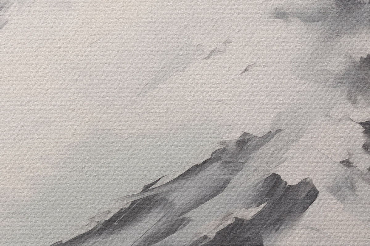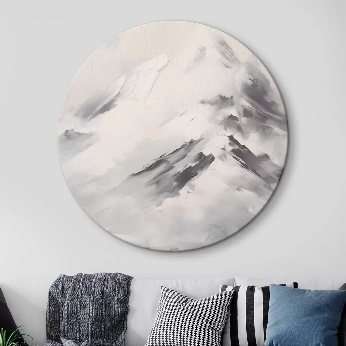 Runde Wandbilder Verschneite Berggipfel mit grauen Schatten, grauer Himmel, Pinselstriche, strukturiert, minimalistisch r45932