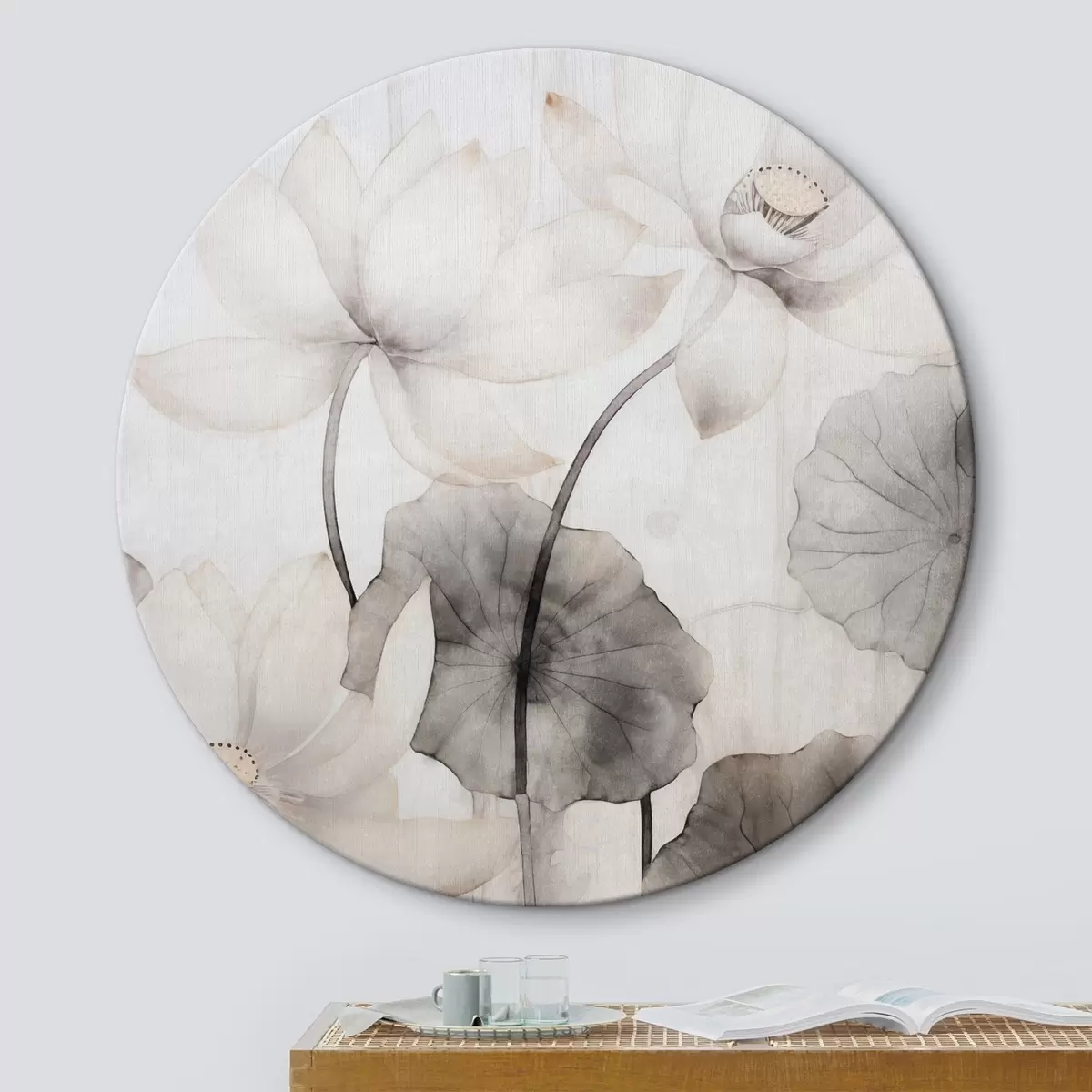 Runde Wandbilder Weiße Lotusblumen mit dunkler Blattstruktur, heller Hintergrund, minimalistisches Design Nr r45937