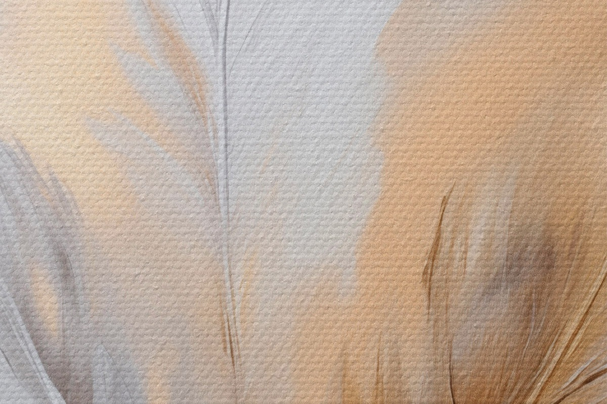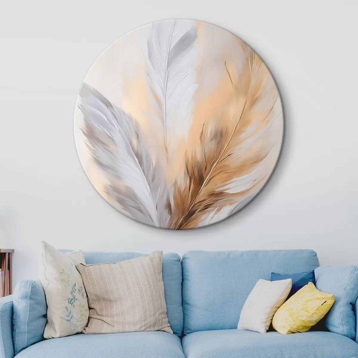 Runde Wandbilder Federn mit orangefarbenen Akzenten, strukturierte minimalistische Komposition, moderne Kunst r45945