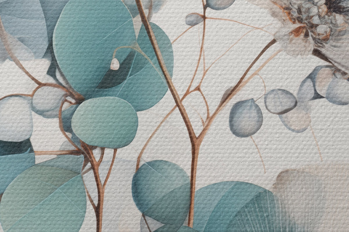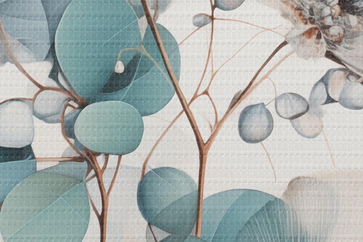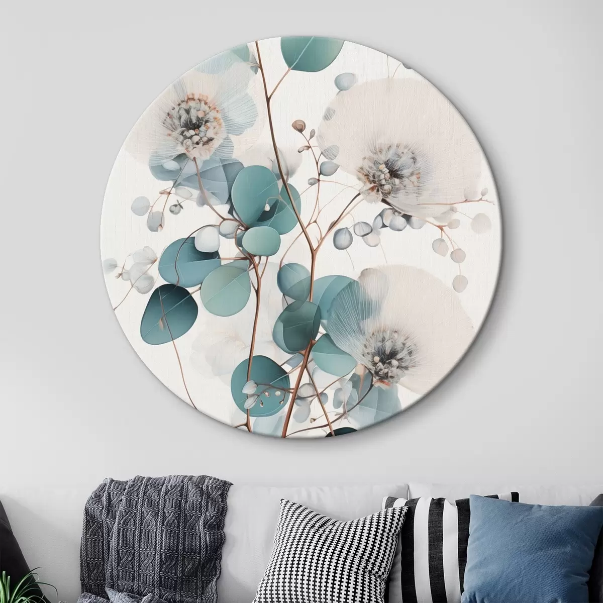 Runde Wandbilder Eukalyptus-Blüten mit weißen Blütenblättern, gedeckten grünen Blättern an Zweigen r45946