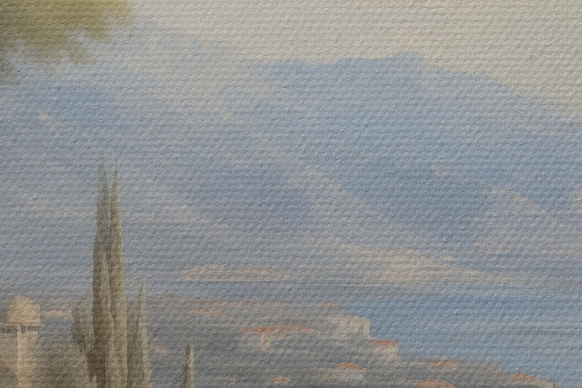 Das feine Fadengeflecht auf dieser Leinwand ähnelt der Oberfläche von professionellen Künstlerleinwänden.