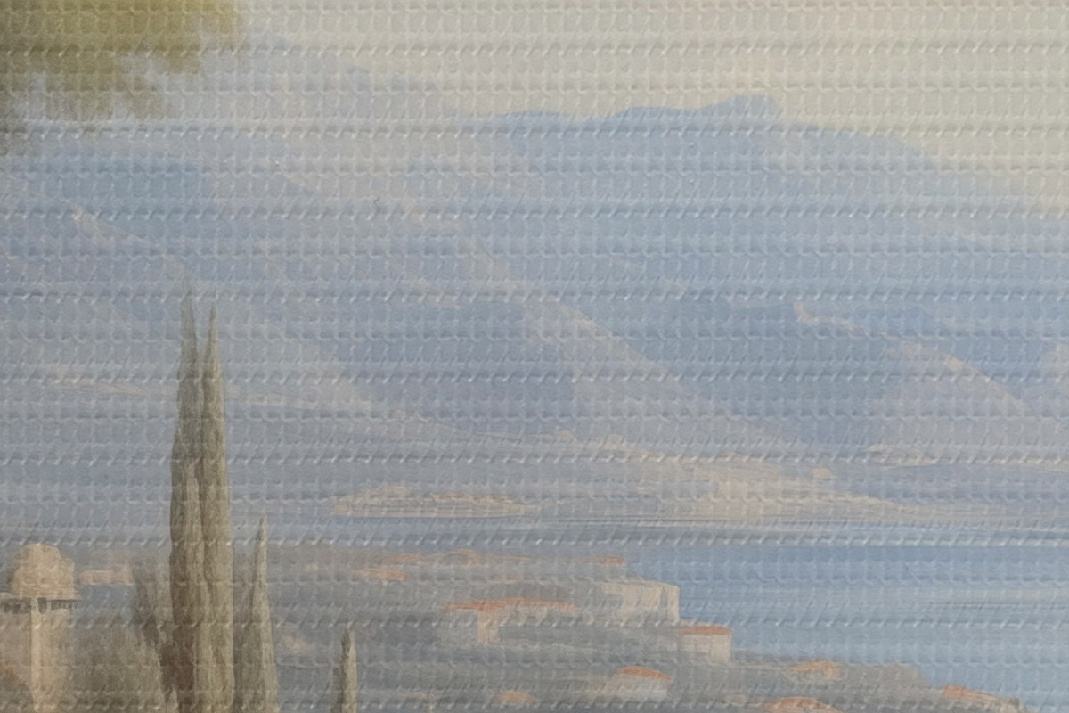 Das Bild kann vorsichtig mit einem trockenen, weichen Tuch oder Schwamm abgewischt werden; es wird nicht empfohlen, feuchte Produkte zu verwenden. Die Verwendung eines feuchten Schwamms ist nur zulässig, wenn das Bild lackiert wurde.