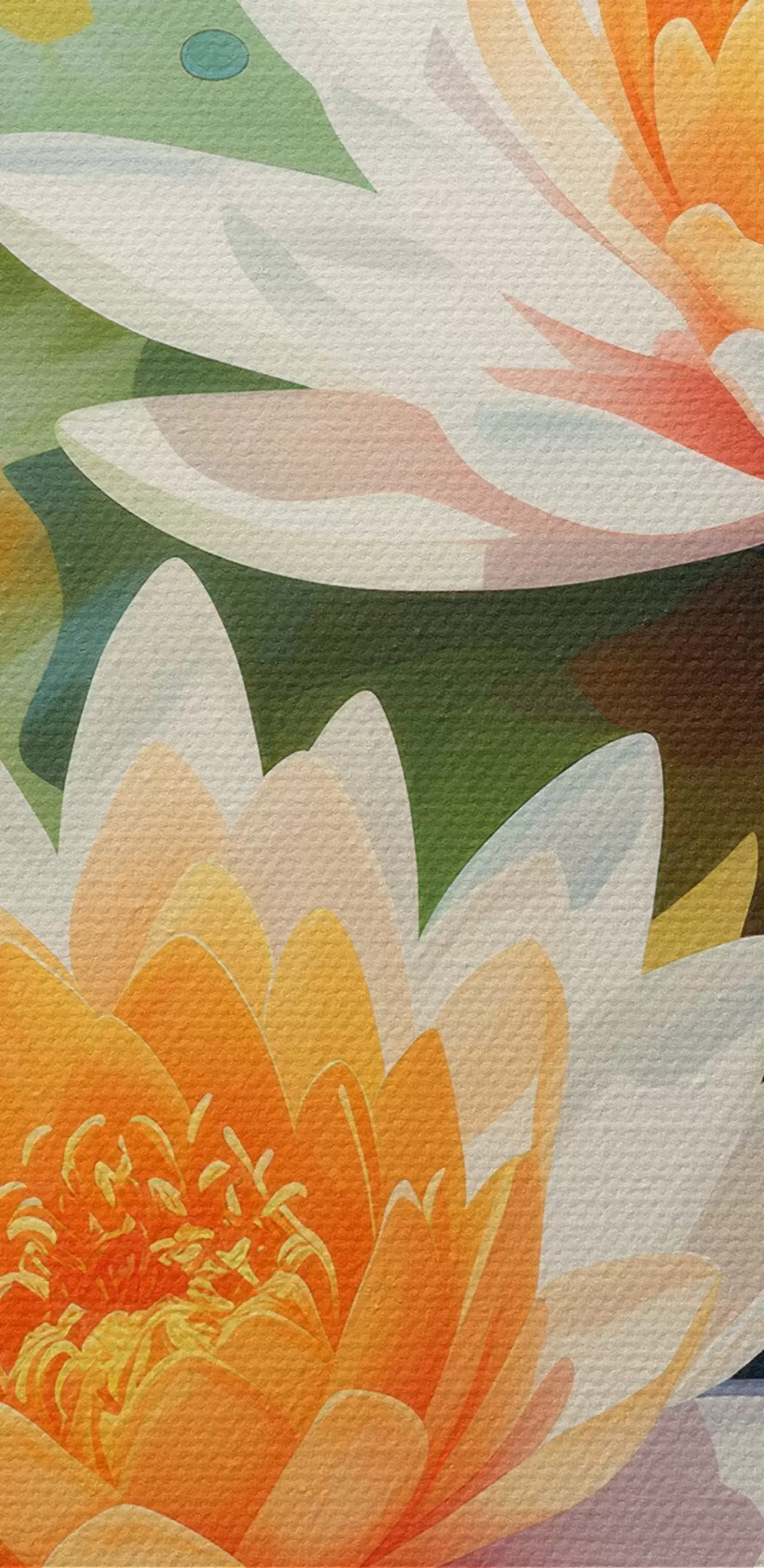 Drei Materialtypen stehen zur Verfügung: Economic Canvas - ein dichtes und haltbares Material für den Digitaldruck, identisch mit Malerleinwand, wasserfeste Oberfläche, realistische Wiedergabe von Details, mittelkörniges Material. Premium Canvas - die Textur ähnelt der einer Malerleinwand (verwobene kleine Fäden). Weiche, detaillierte Wiedergabe des Bildes auf einer matten Oberfläche. Eco-Premium - hochwertiges Gewebe aus 100% Baumwolle. Dank der natürlichen Baumwollfasern ist das Material langlebig und verschleißfest. Hervorragende Farbwiedergabe und Detailtreue.