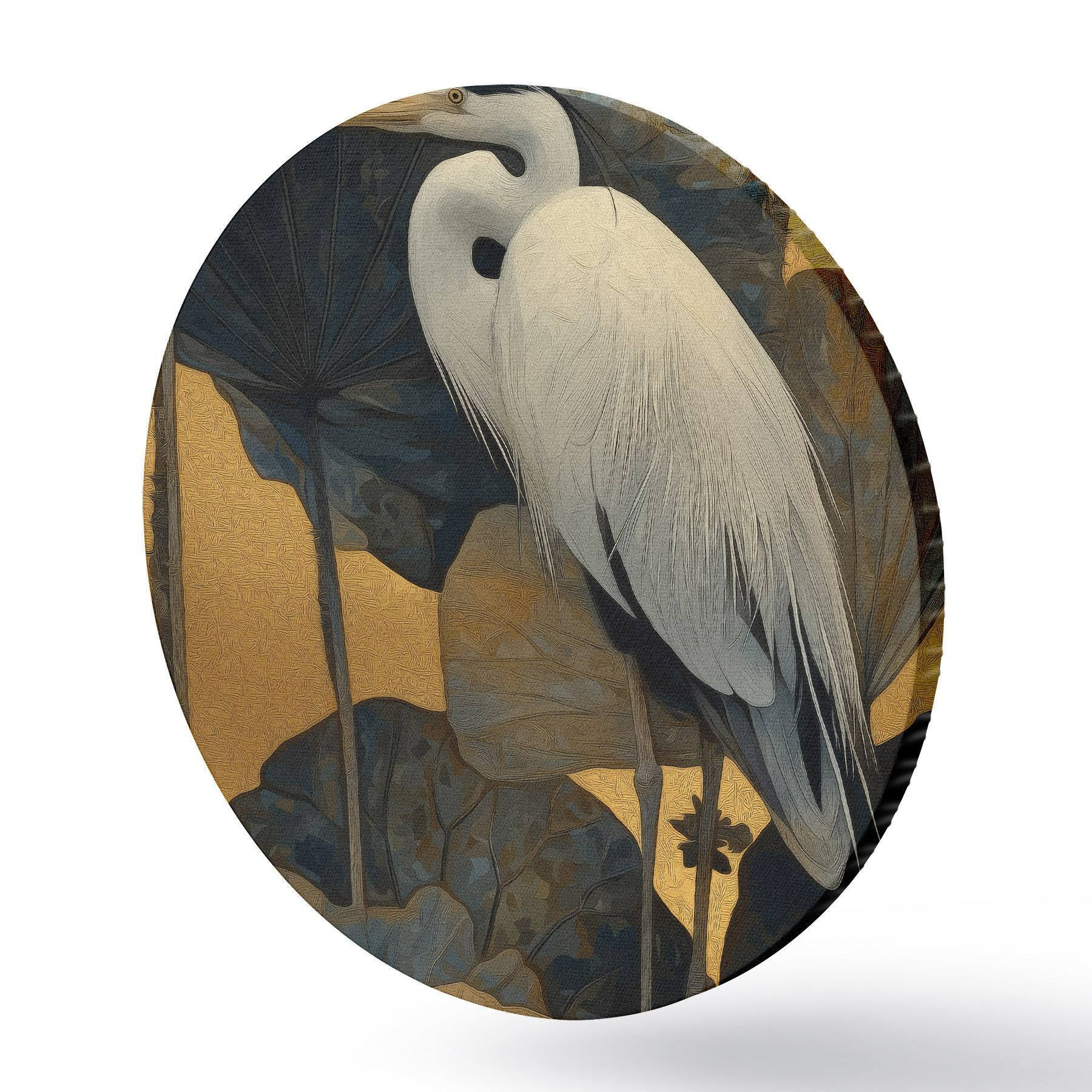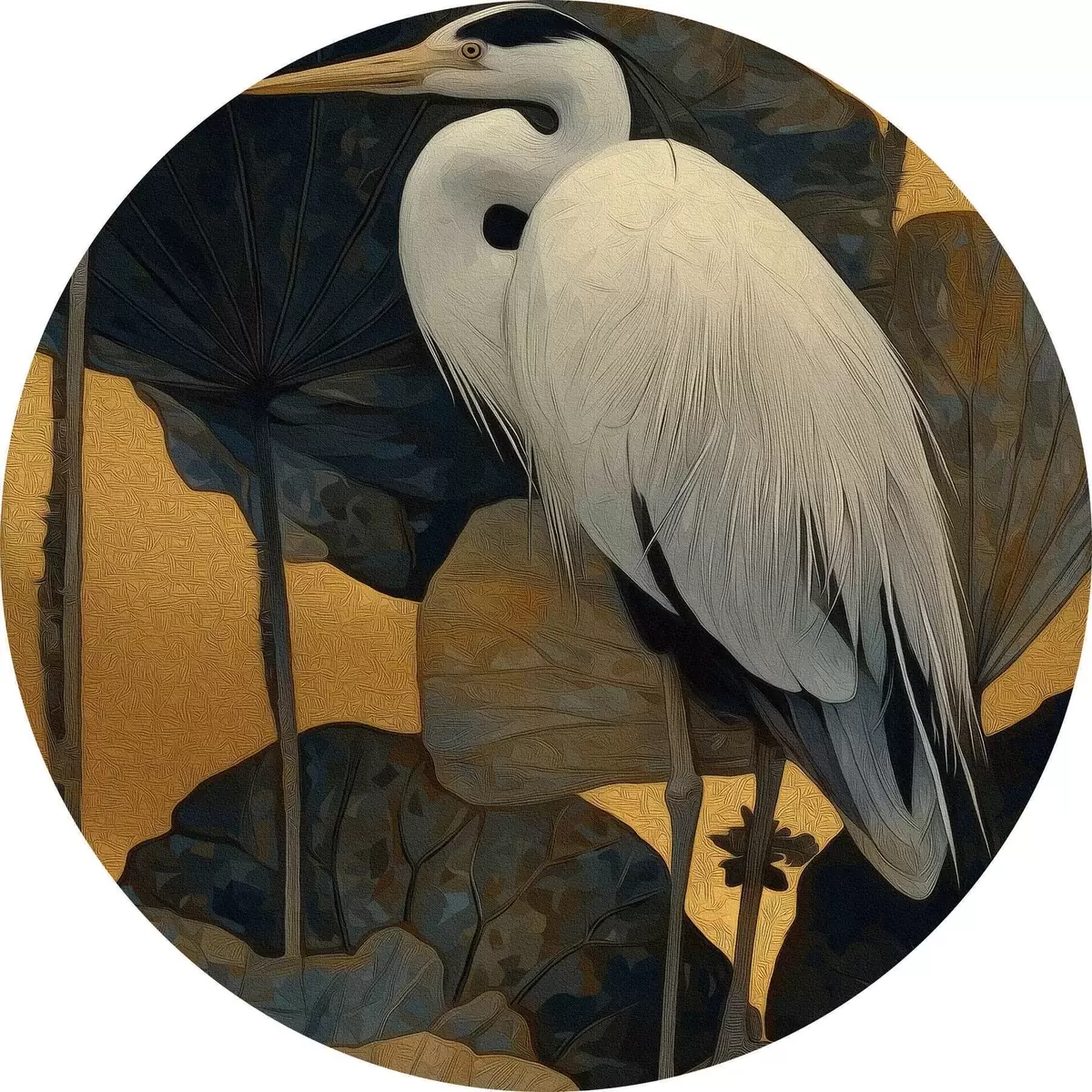 Runde Wandbilder Weißer Reiher zwischen großen Blättern auf warmem Hintergrund r46147