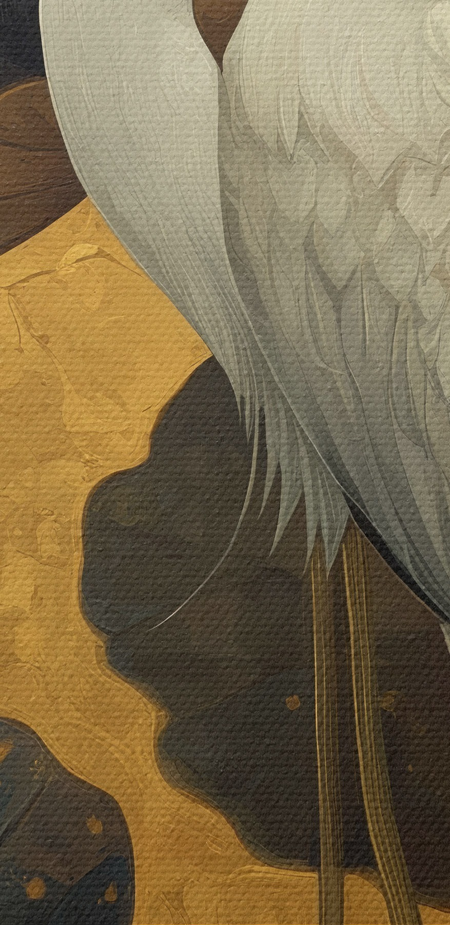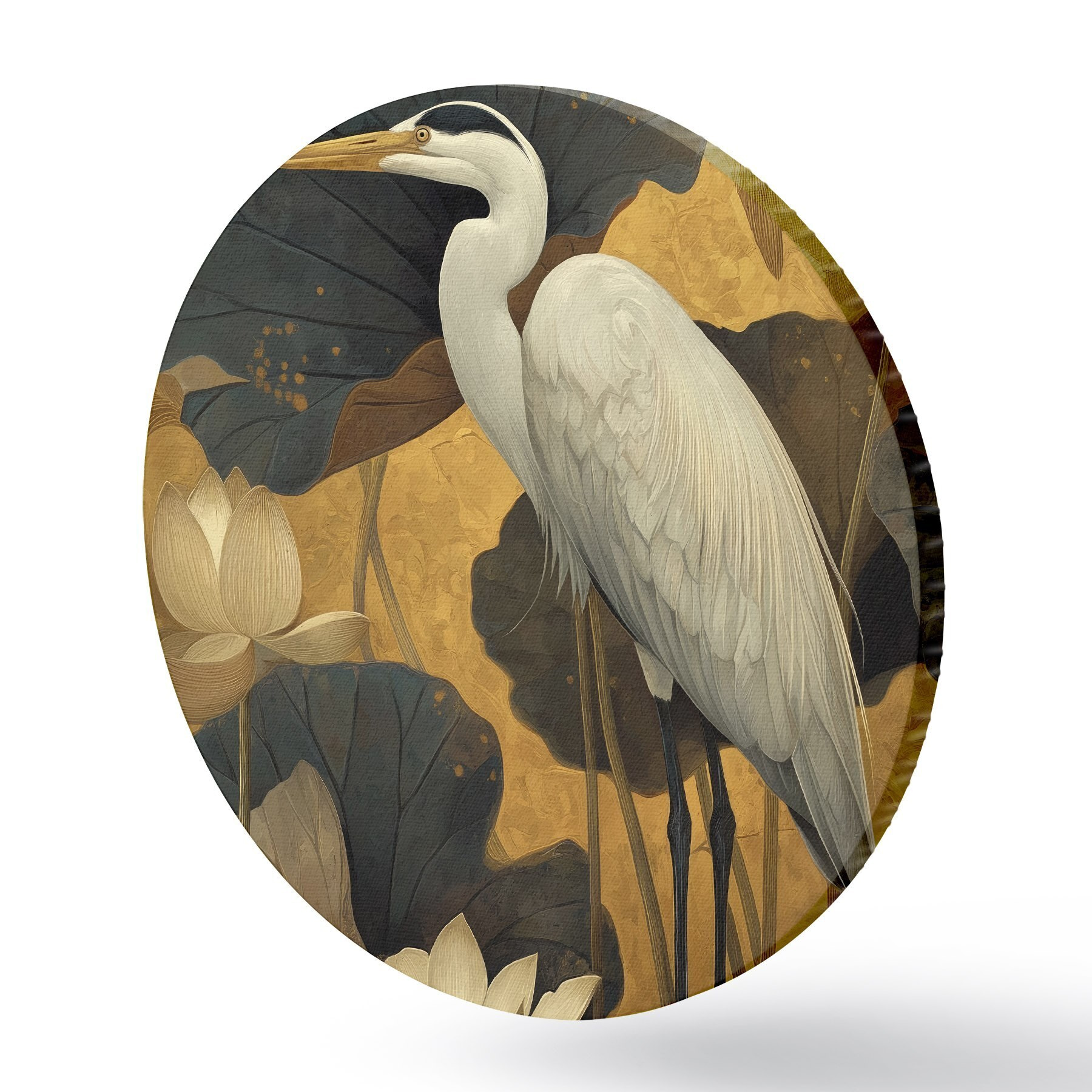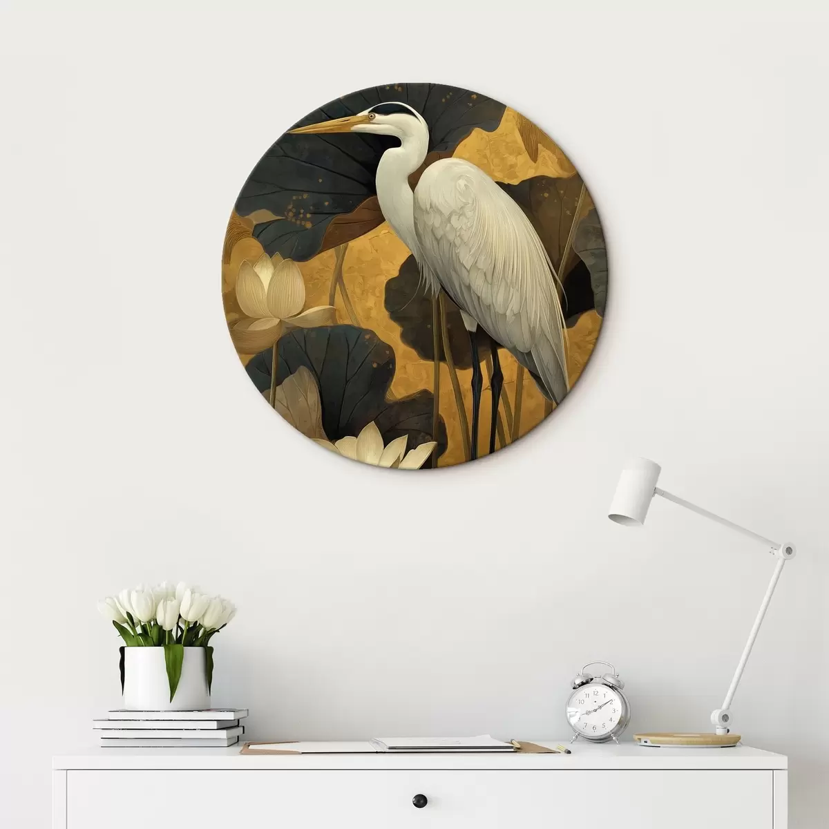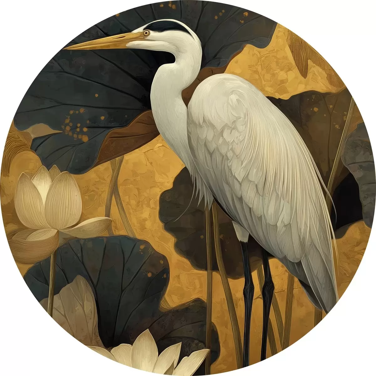 Runde Wandbilder Reiher zwischen Lotusblumen auf warmem Hintergrund Nr r46148