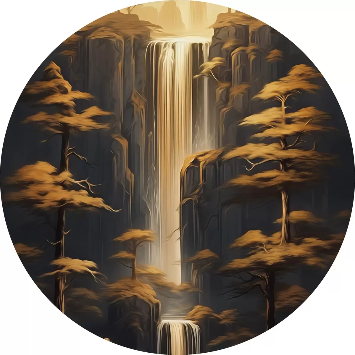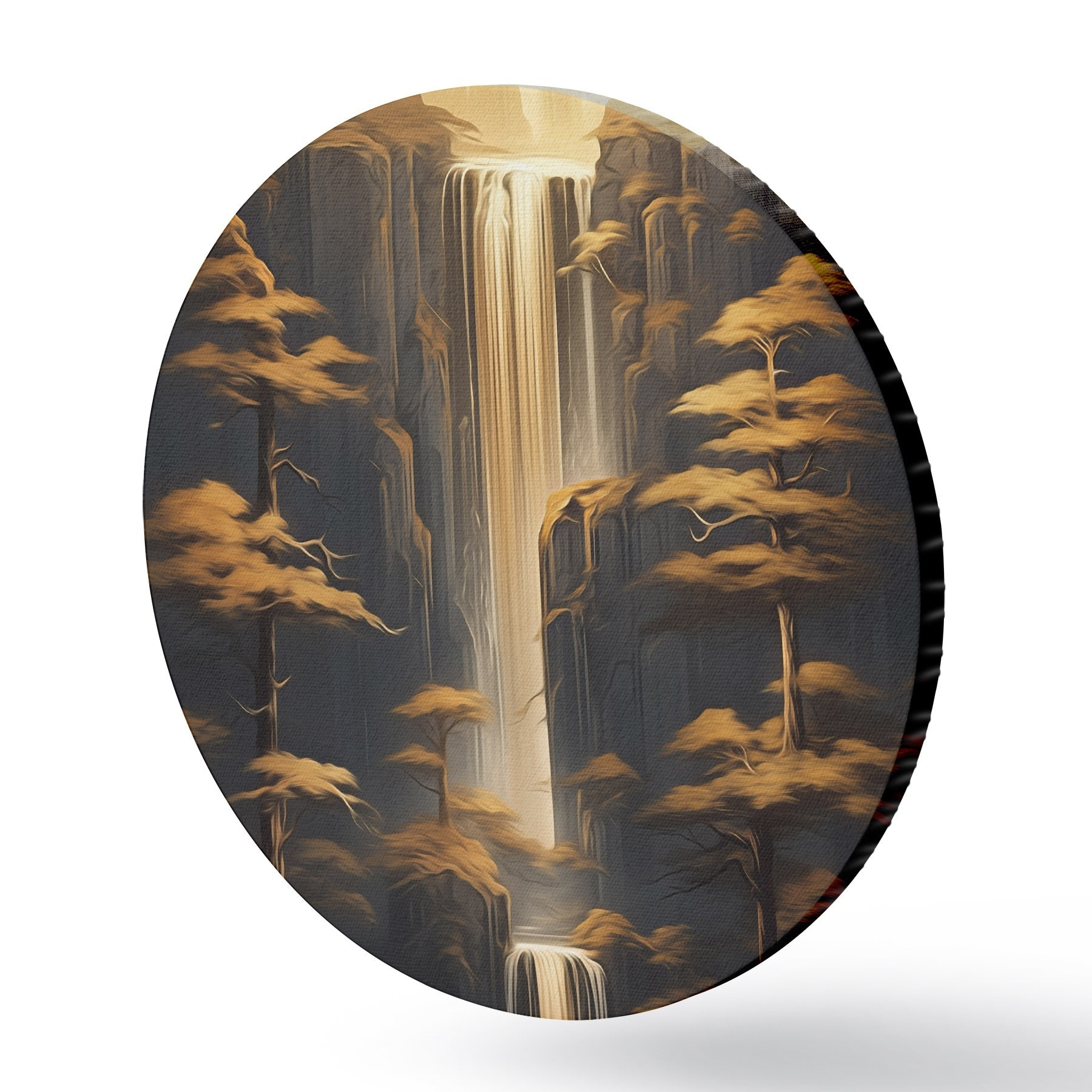 Runde Wandbilder Hohe Klippen mit einem Wasserfall und Kiefern im Abendlicht Nr r46151