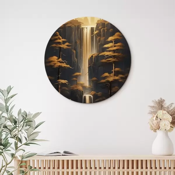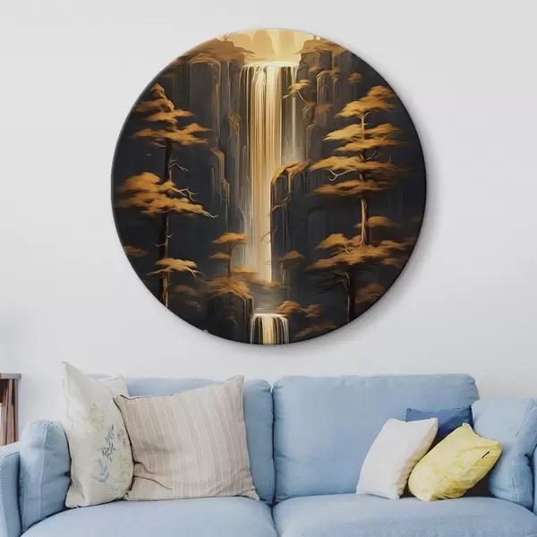 Runde Wandbilder Hohe Klippen mit einem Wasserfall und Kiefern im Abendlicht r46151