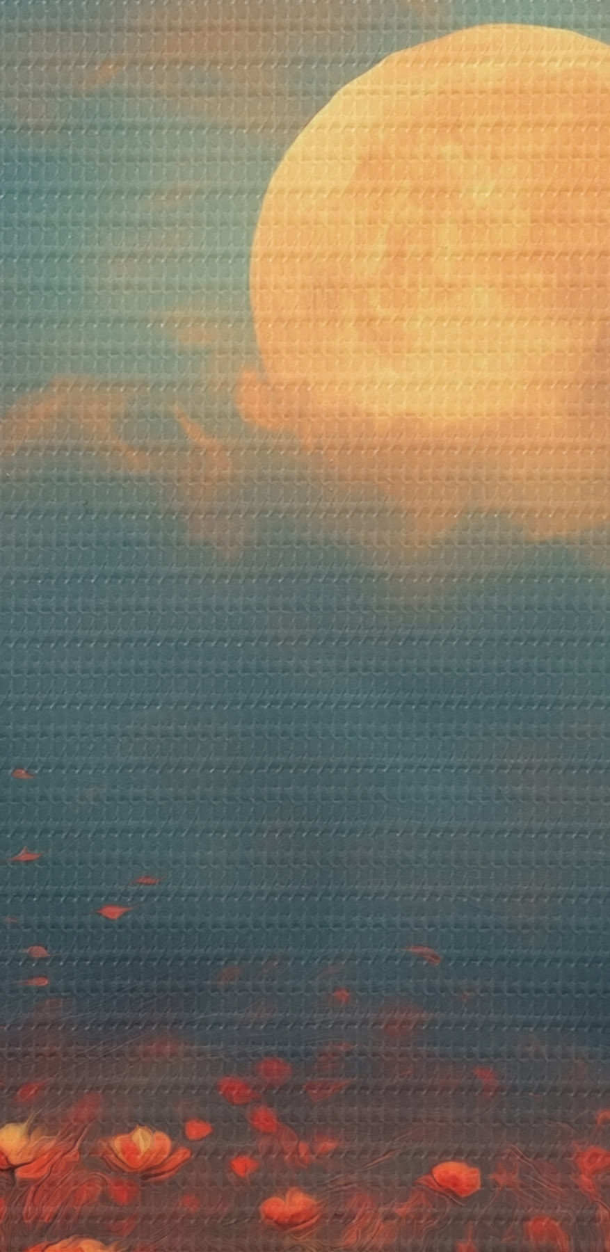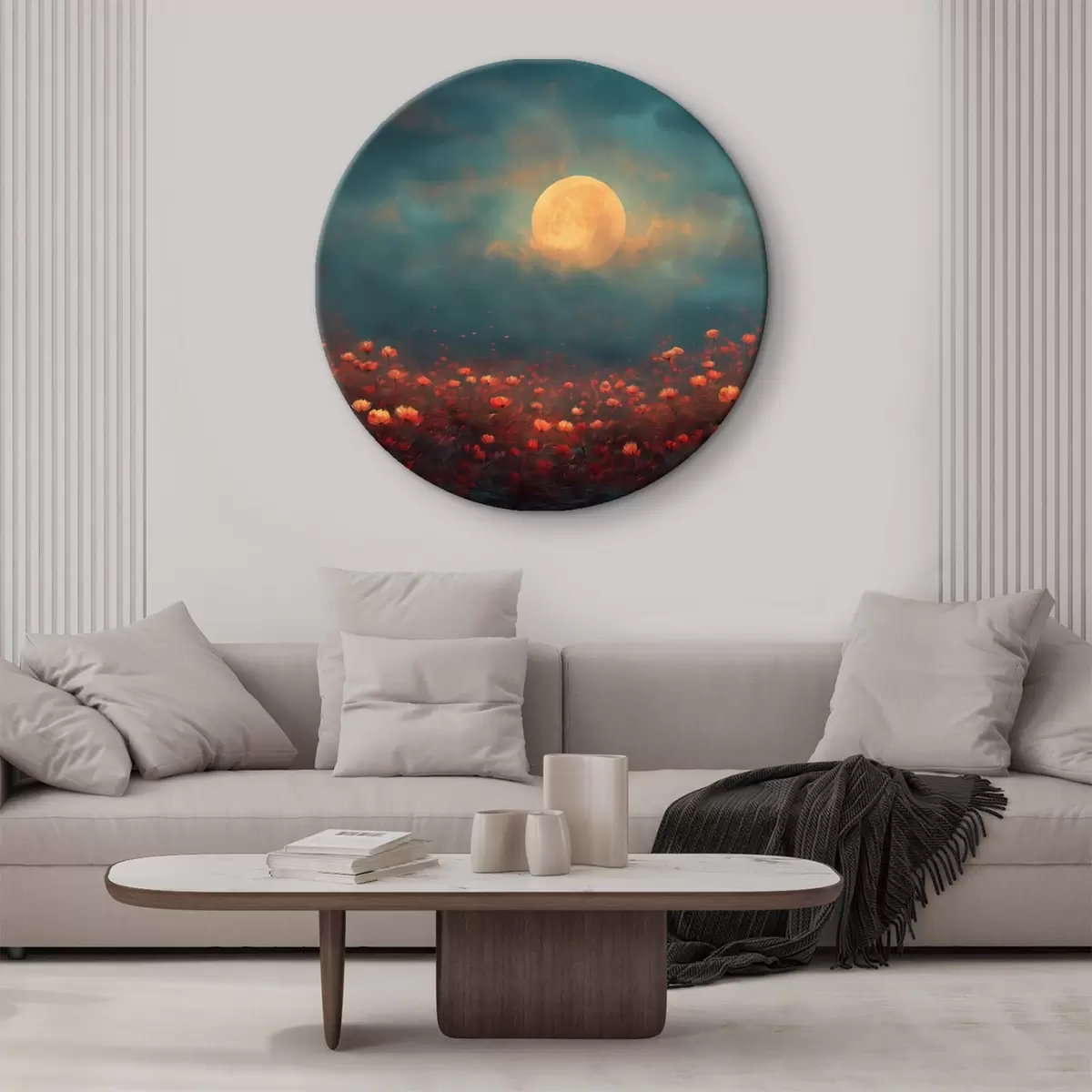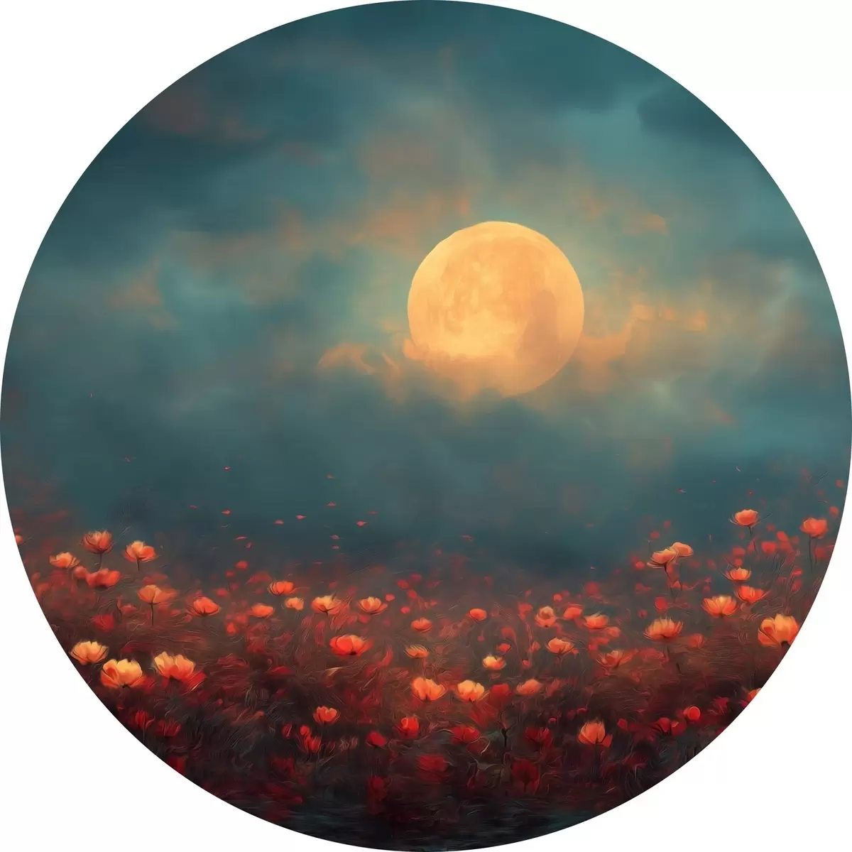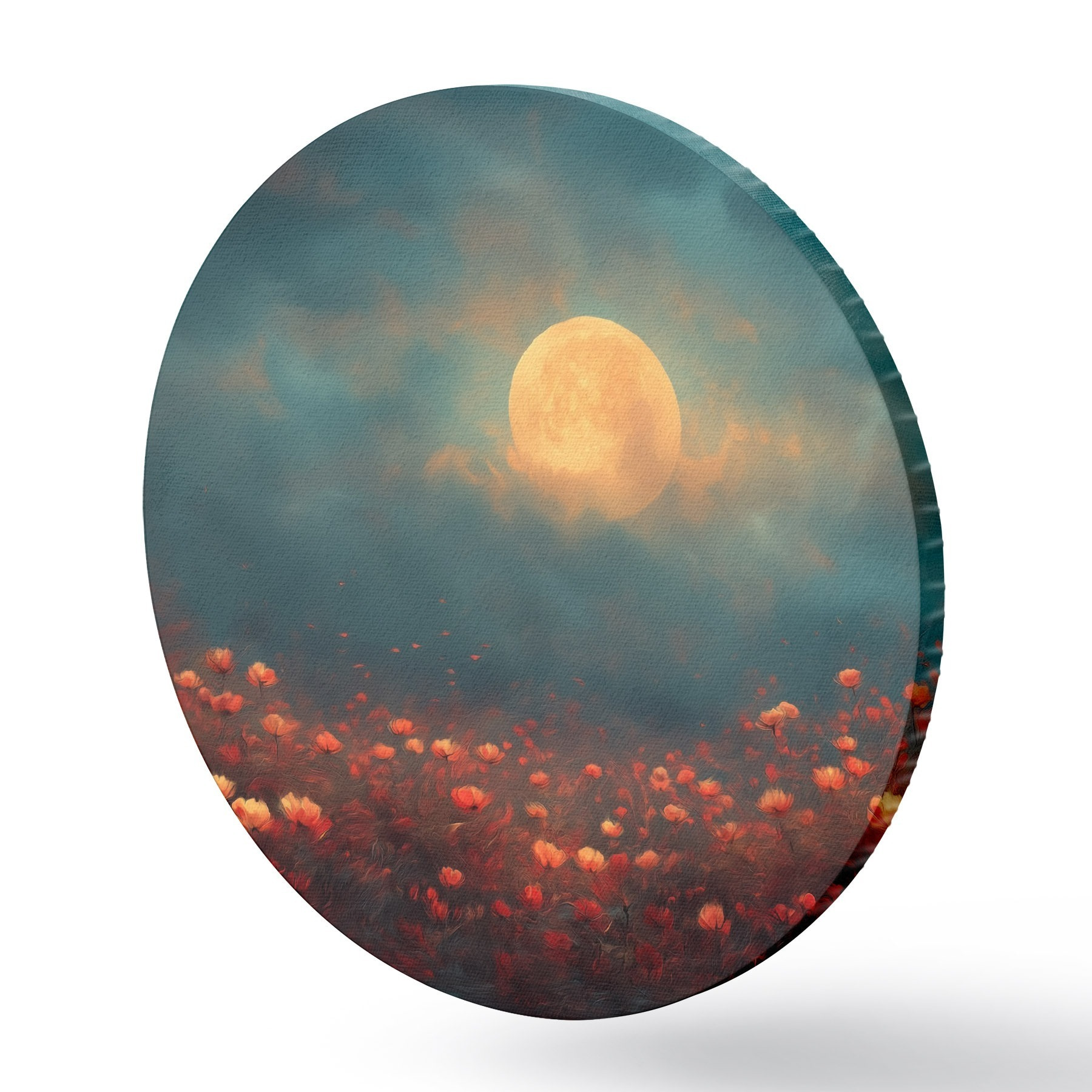 Runde Wandbilder Mond über einem Feld voller roter Blumen an einem nebligen Abendhimmel Nr r46167
