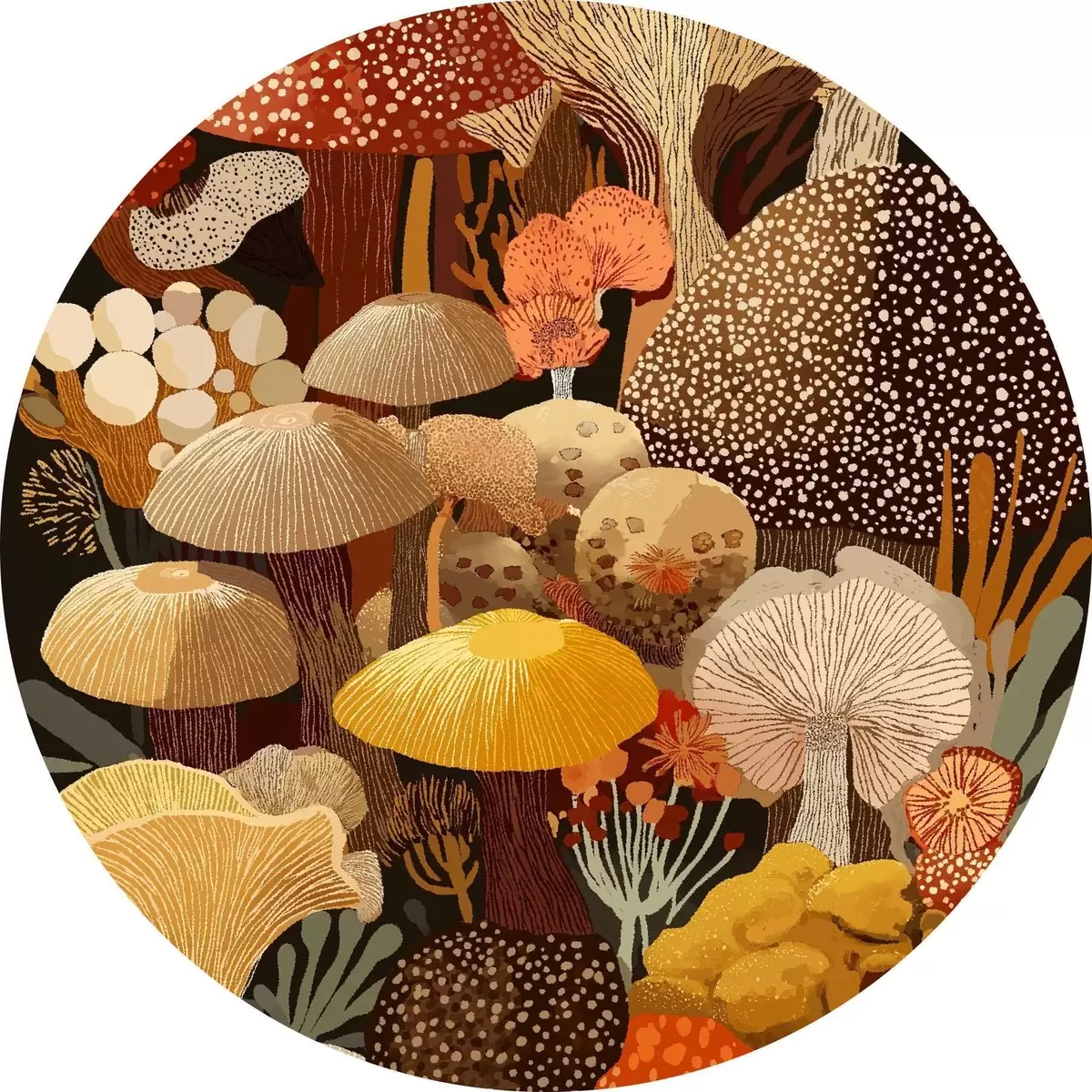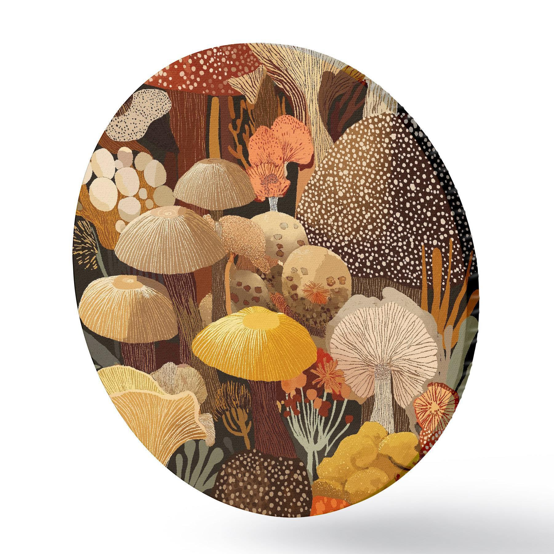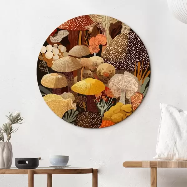 Runde Wandbilder Komposition verschiedener Waldpilze in warmen Farbtönen r46170