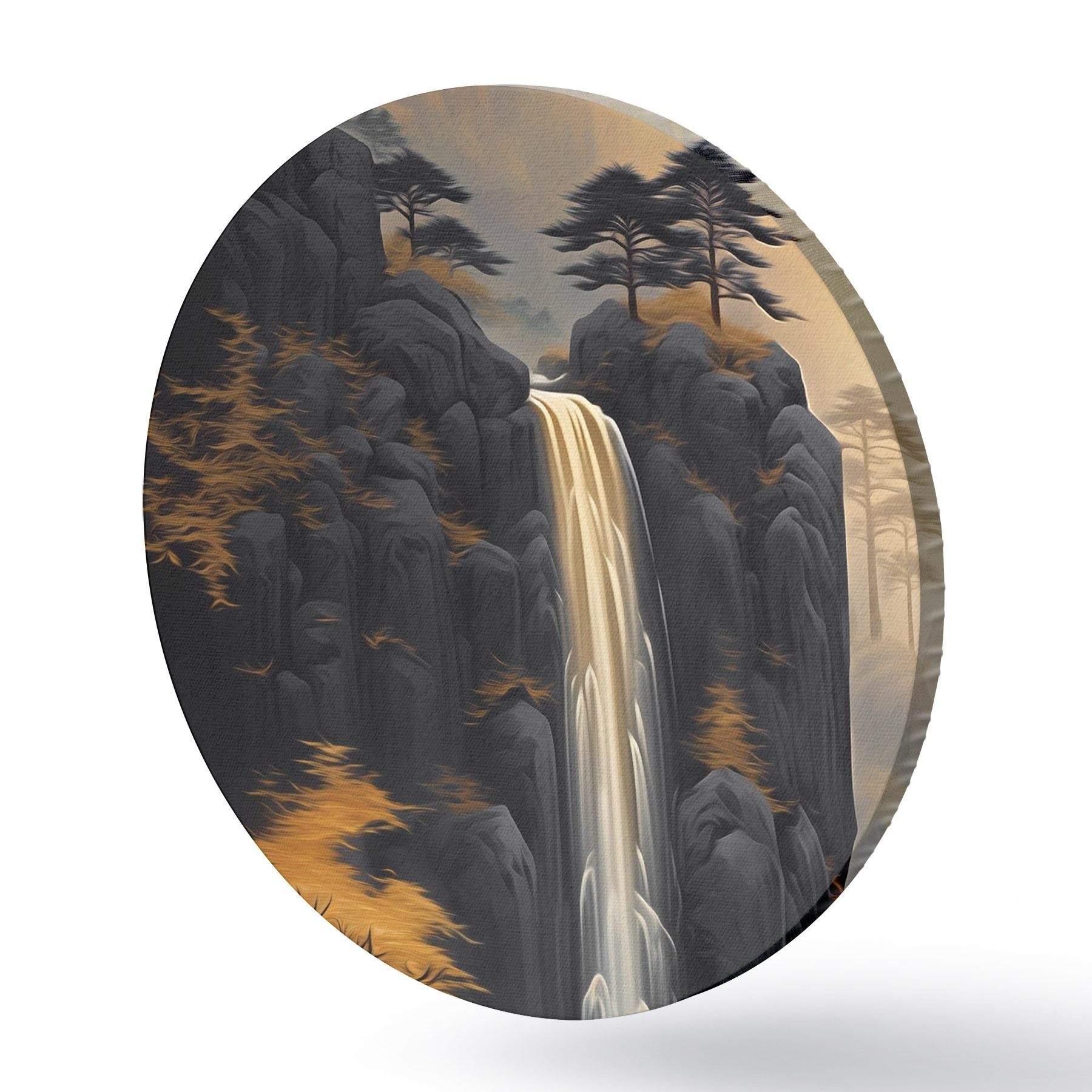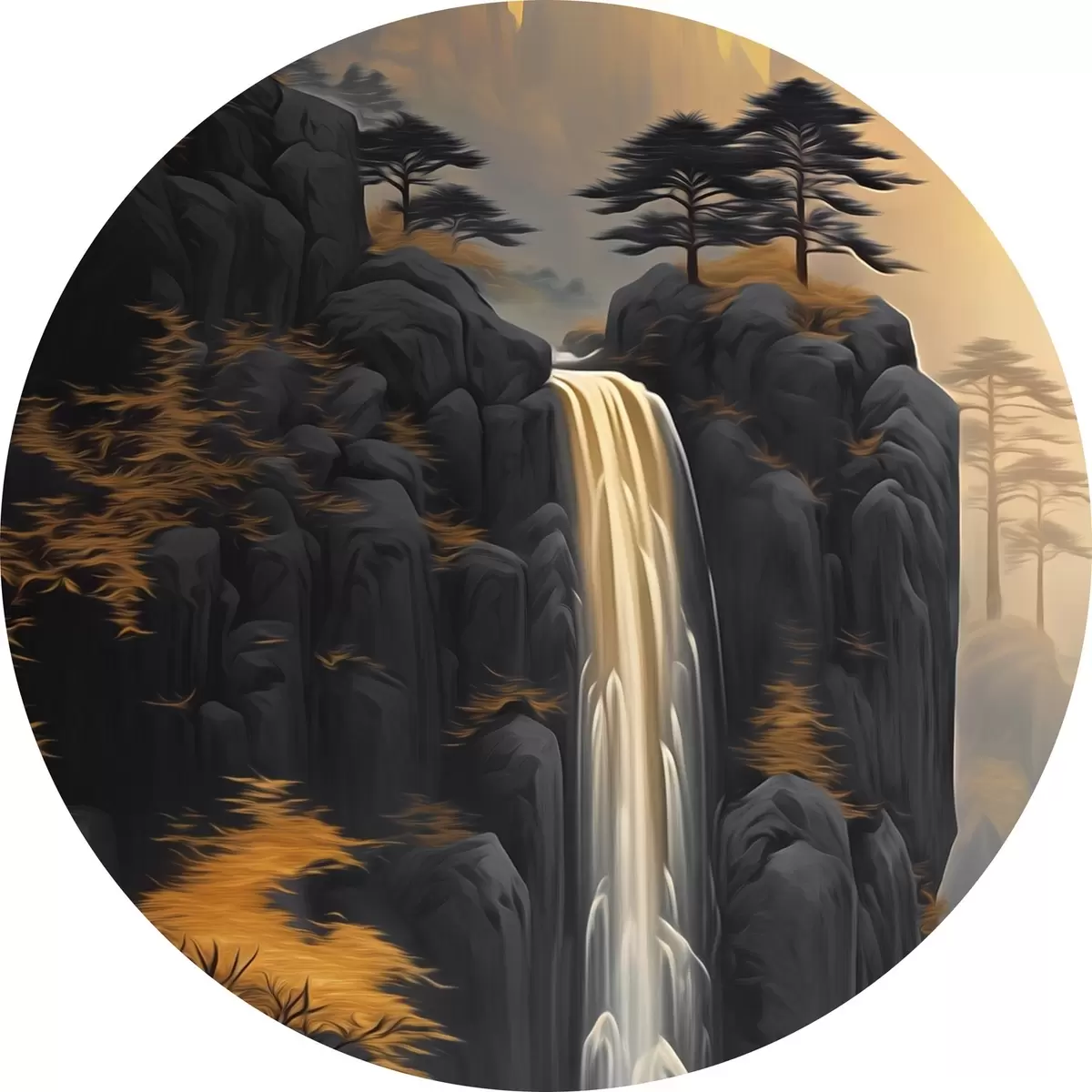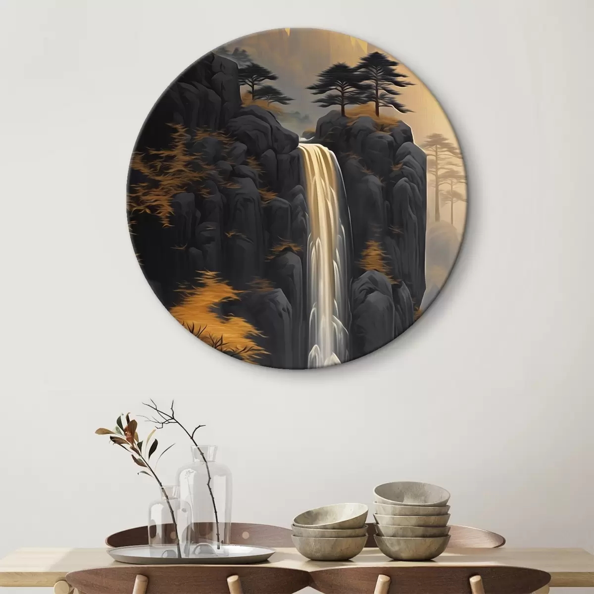 Runde Wandbilder Felsige Landschaft mit einem Wasserfall in warmen Sonnenuntergangsfarben Nr r46177