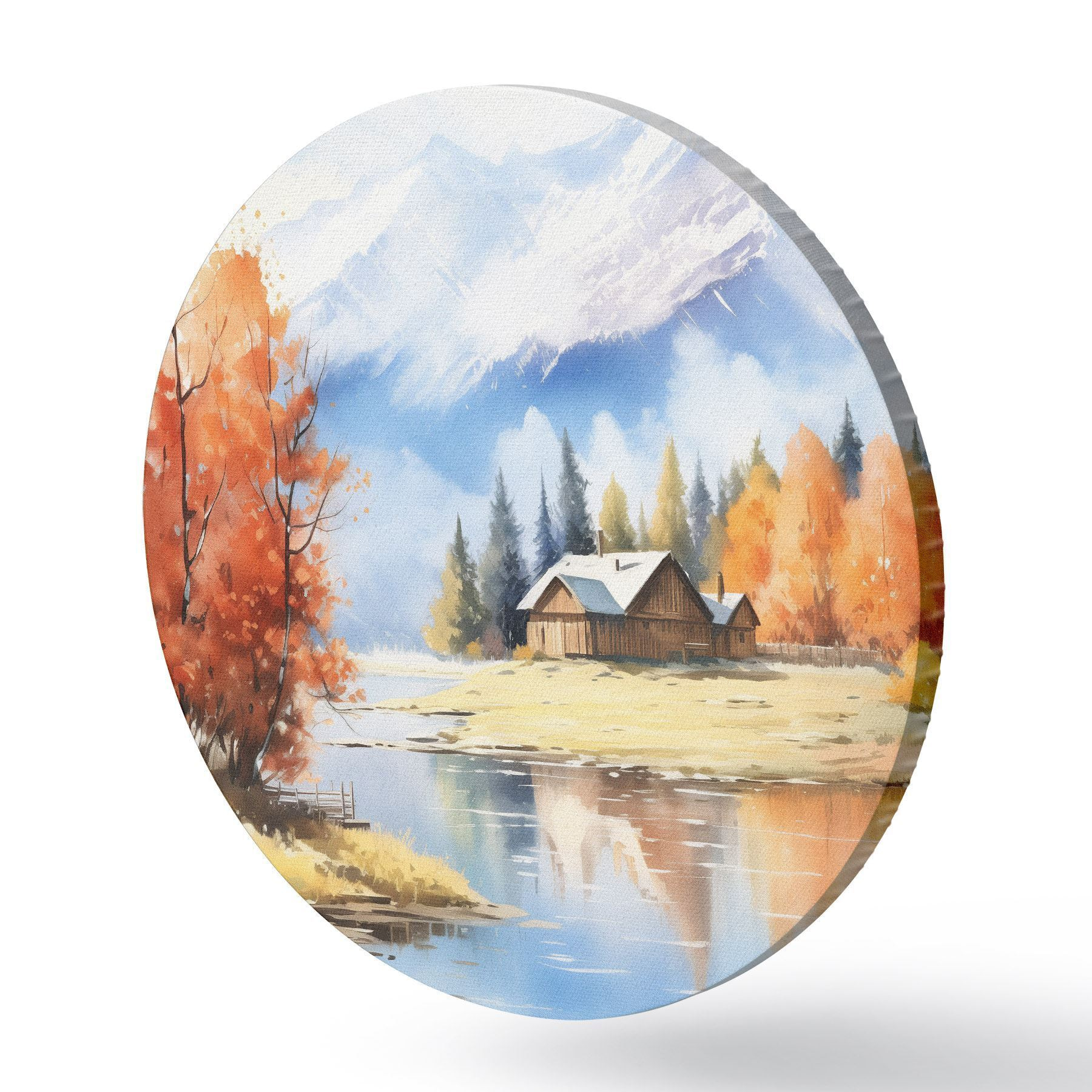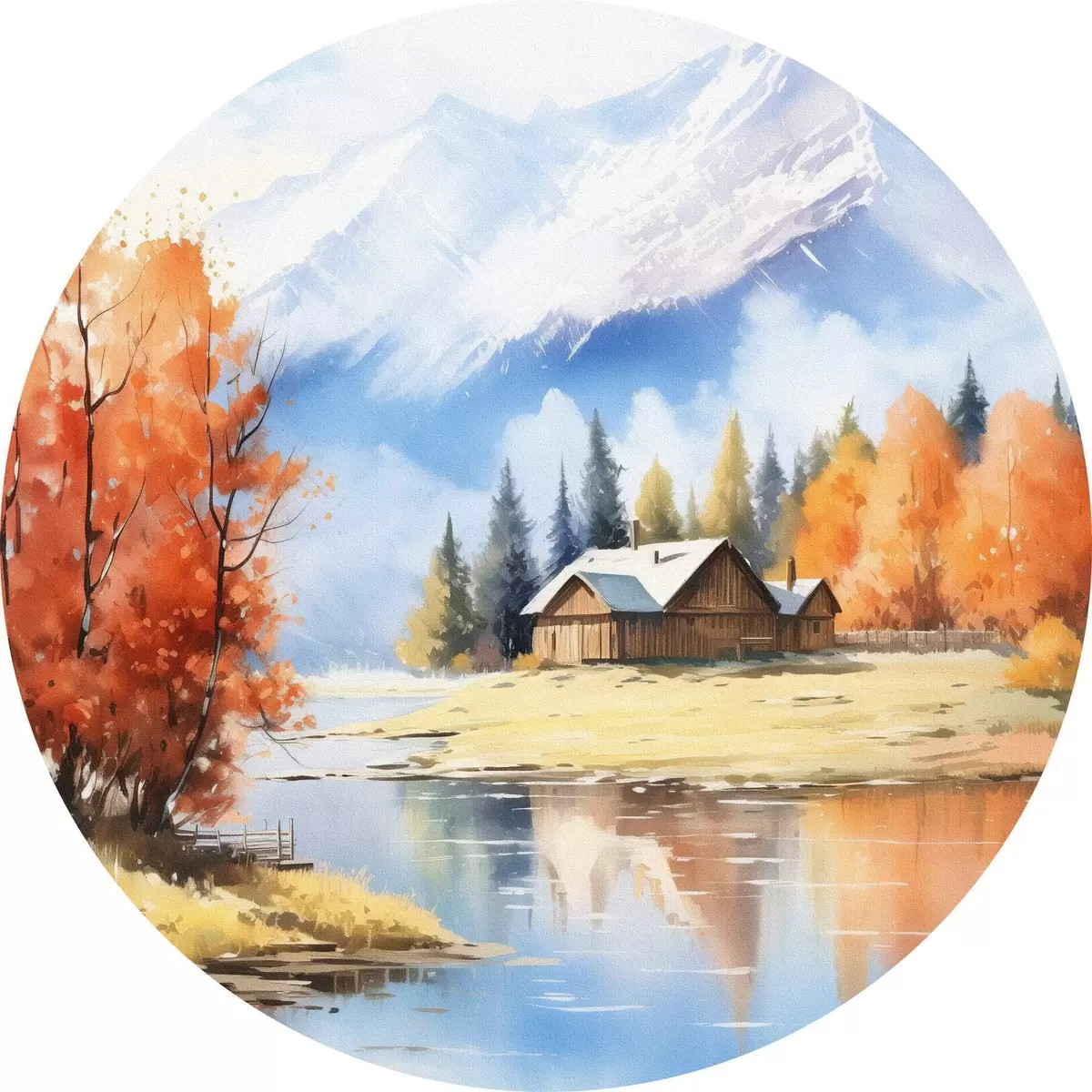 Runde Wandbilder Herbstlandschaft am See mit einem Haus und Bergen Nr r46184