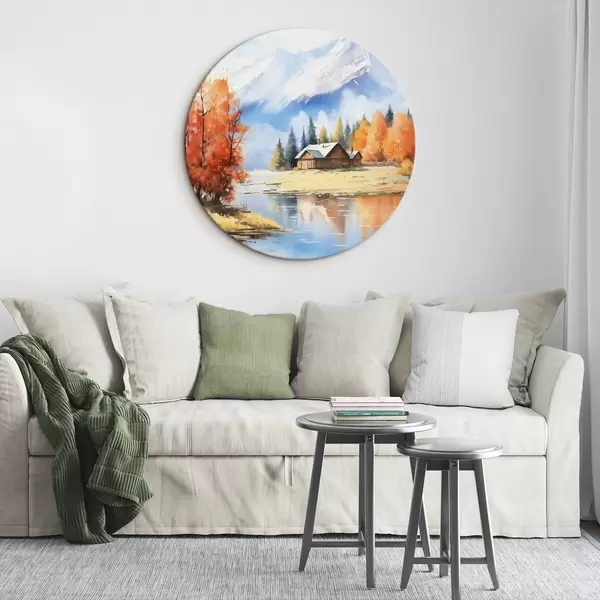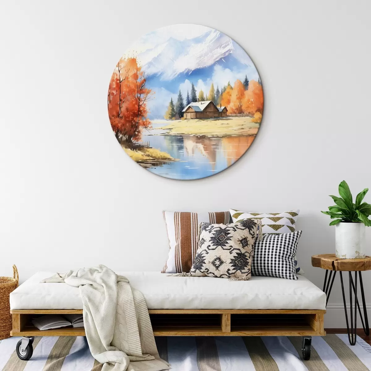 Runde Wandbilder Herbstlandschaft am See mit einem Haus und Bergen r46184