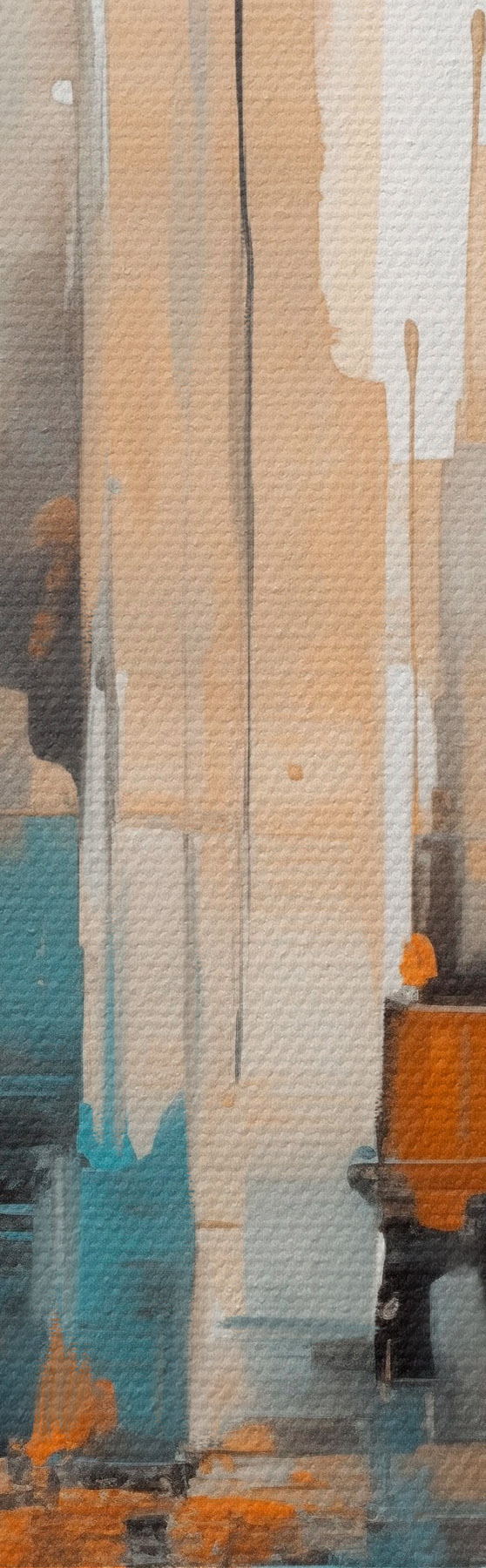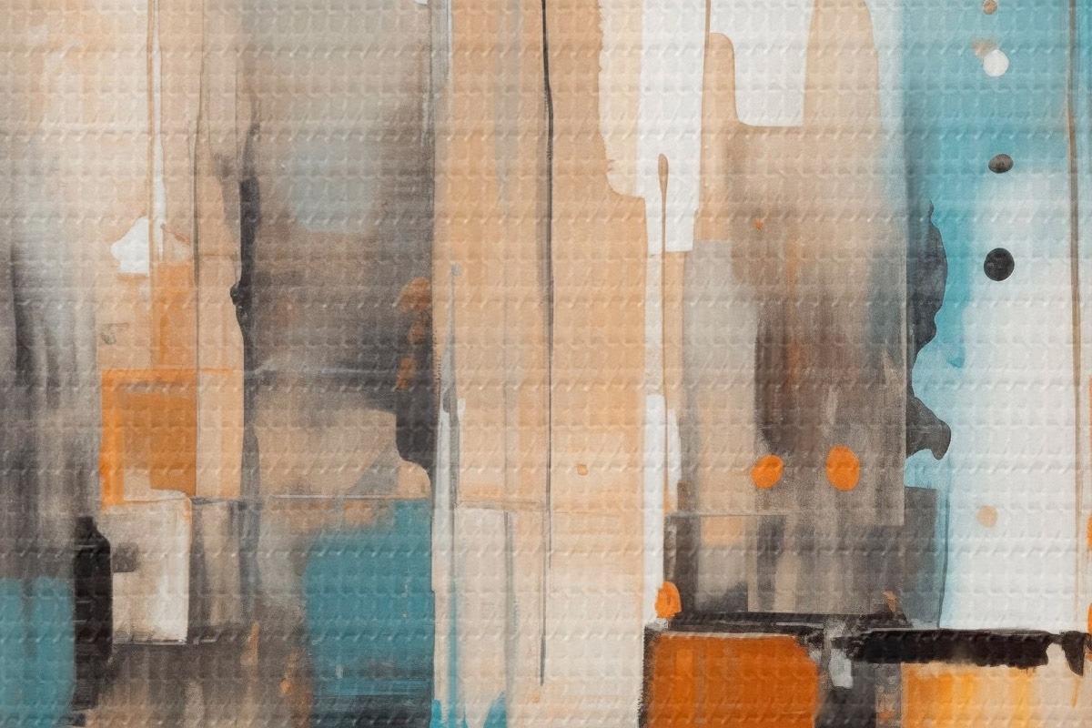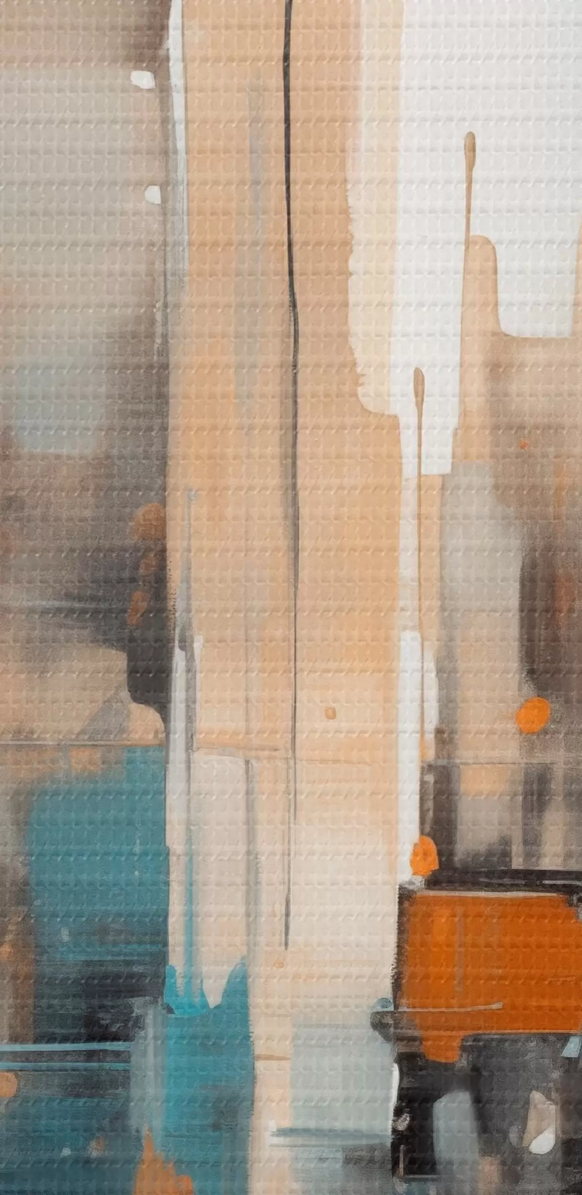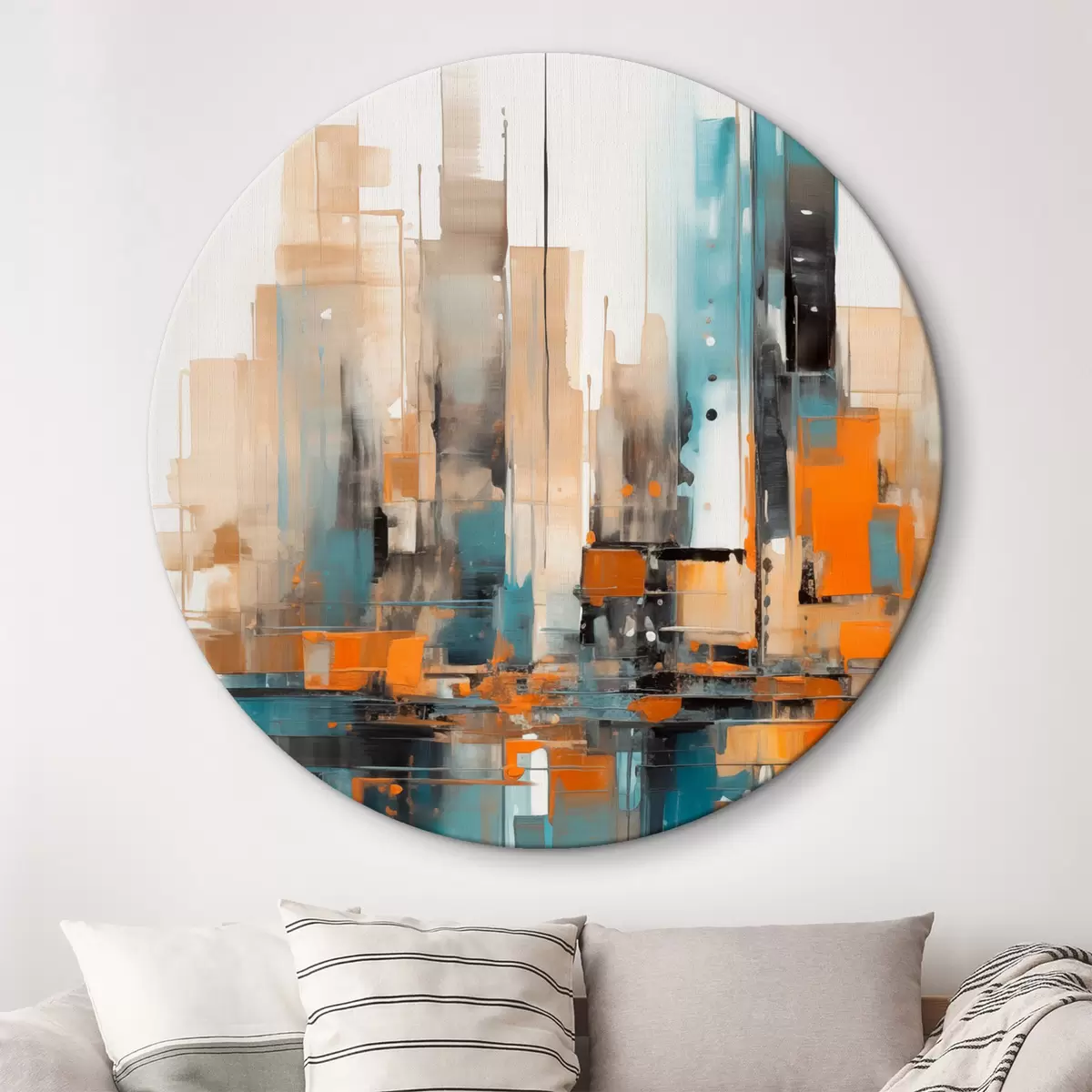 Runde Wandbilder Abstrakte Stadtlandschaft mit orangefarbenen, blaugrünen und braunen vertikalen Pinselstrichen und geometrischen Formen r46266