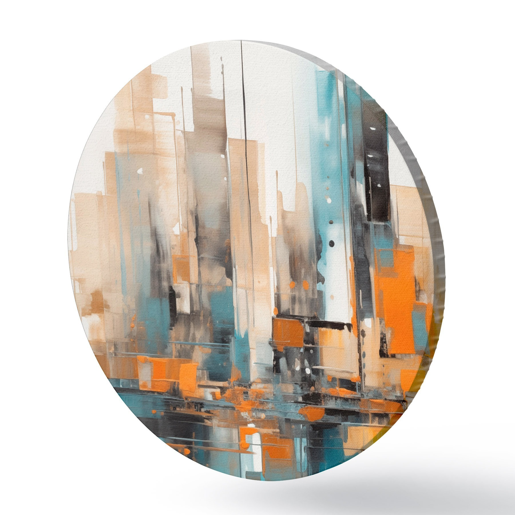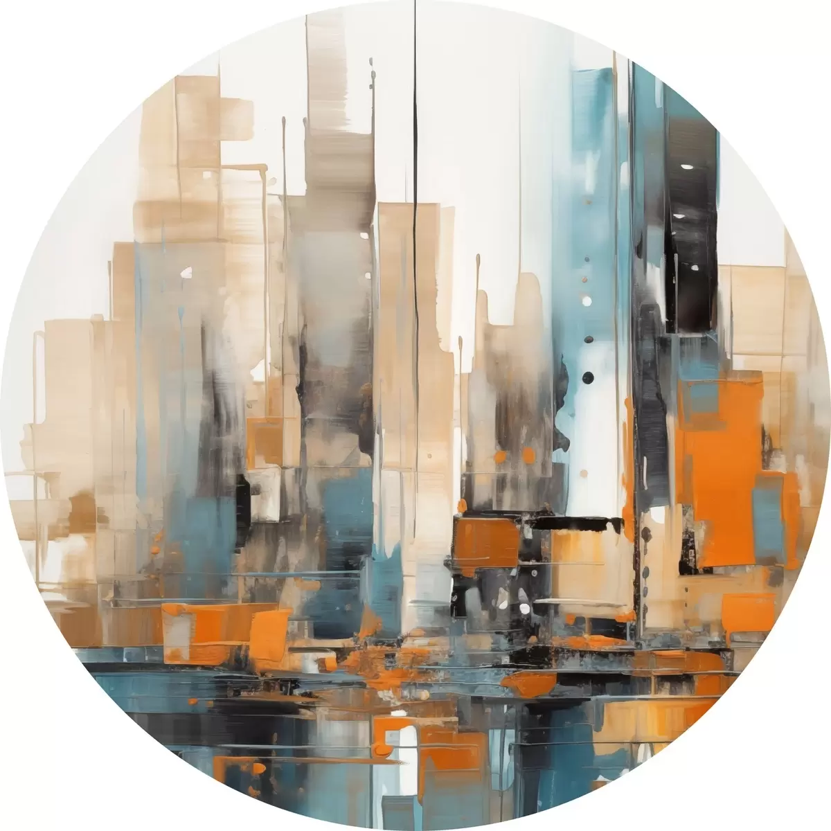 Runde Wandbilder Abstrakte Stadtlandschaft mit orangefarbenen, blaugrünen und braunen vertikalen Pinselstrichen und geometrischen Formen r46266
